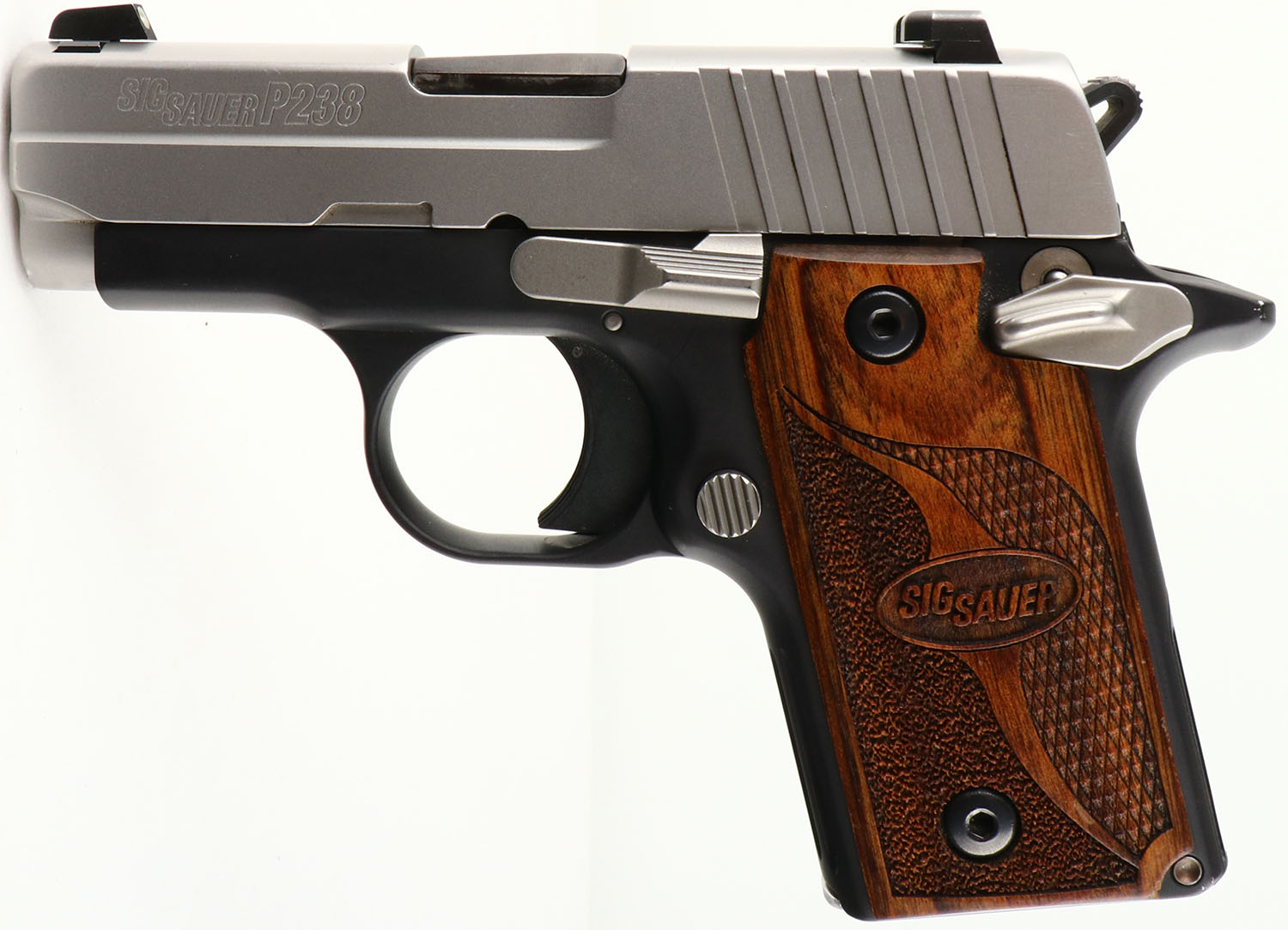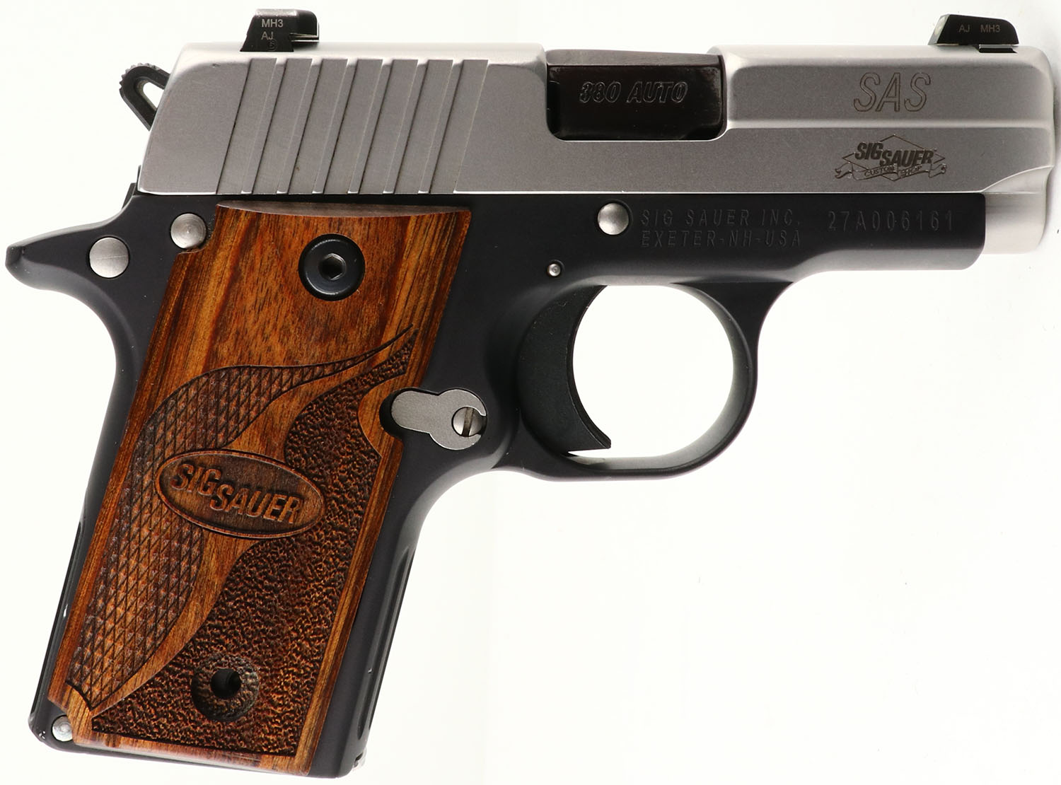 Sig Sauer Custom Shop, Model P238 SAS, CAL: .380 AUTO, MFG: Modern, SN: 27A006161, Semi Auto Pistol, 2 3/4'' barrel. The Sig Sauer checkered & textured wood grips are excellent. The matte black finish on the frame rates 99% & the stainless steel finish on the slide is excellent. Bore is excellent. The slide holds SIGLITE Day/Night sights. From Sig: The P238 SAS features the SIG Anti-Snag carry melt treatment applied by the SIG custom shop. The SAS process aggressively dehorns all of the edges and rounds all of the corners resulting in a comfortable ultra smooth profile that is ideal for concealed carry. FFL Req. - Value: 500 to 700