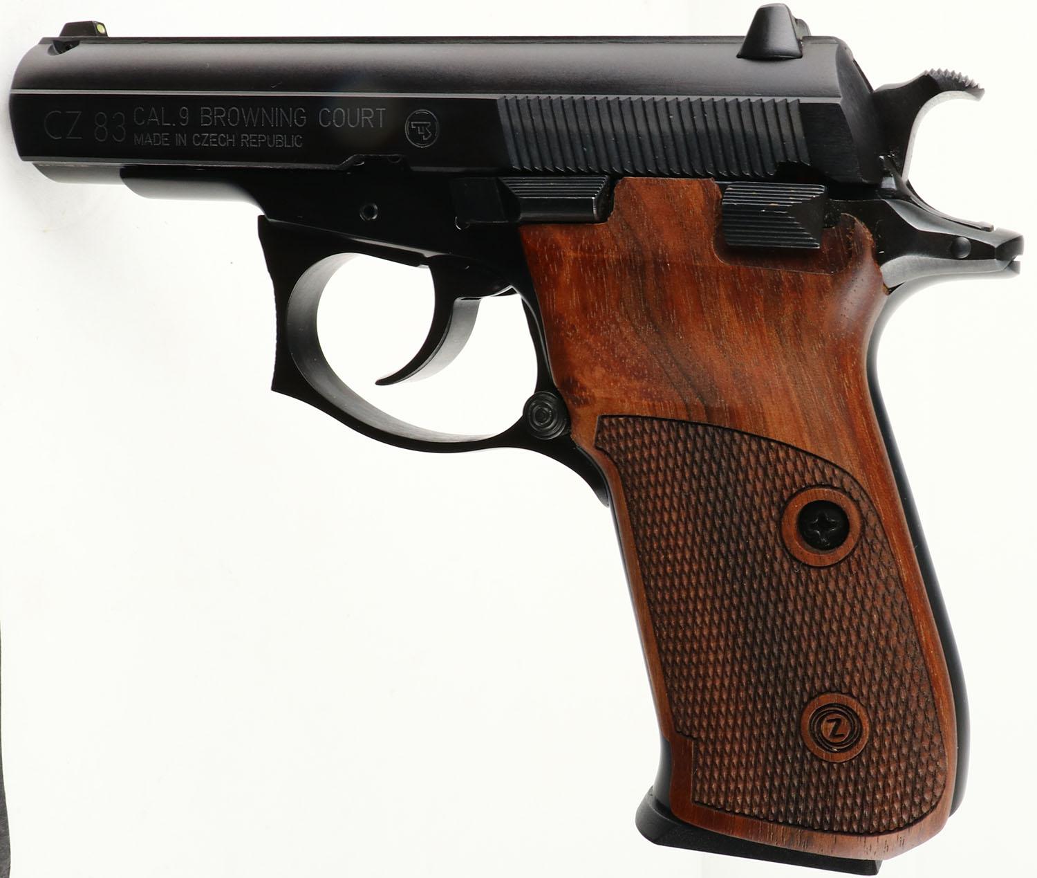 CASED, CZ, Model 83, CAL: 9mm Browning Court (.380), MFG: Modern, SN: B051588, Semi Auto Pistol, 3 3/4'' barrel. The CZ logo checkered wood grips are excellent. The factory metal blue finish on the frame & slide rates 99%+. Bore is excellent & minty. Factory sights. Comes in factory hard case, with owners manual, extra magazine & a set of checkered plastic grip panels. FFL Req. - Value: 400 to 800