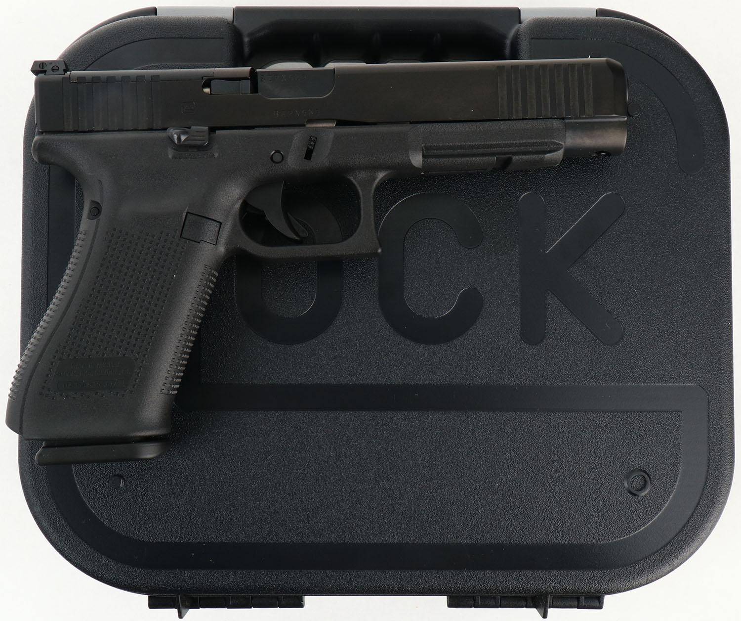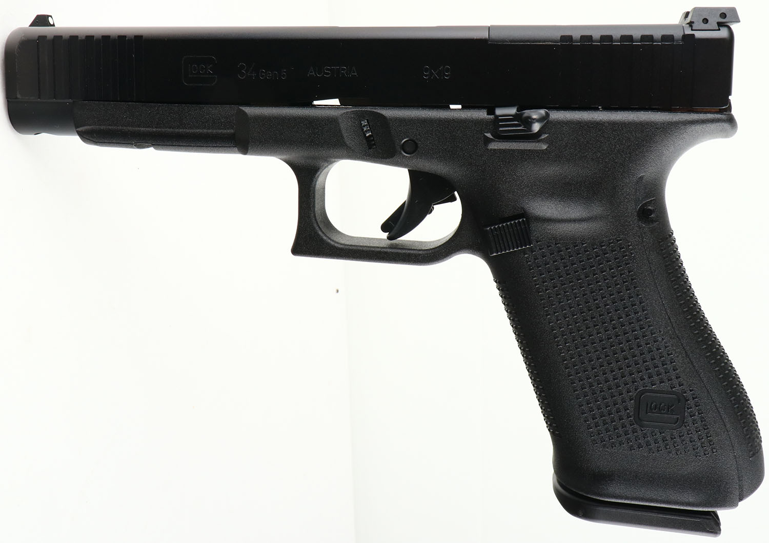 NEW CASED, Glock, Model 34 Gen 5, CAL: 9mm, MFG: Modern, Semi Auto Pistol, 5 1/8'' barrel. The textured polymer grip & frame are mint. The factory matte black finish is mint. Bore is mint. Factory square notch rear sight & white dot front sight. Comes in factory hard case, with owners manual, lock/key, grip attachments, (3) 17rd mags & speed loader. NOS. FFL Req. - Value: 500 to 700