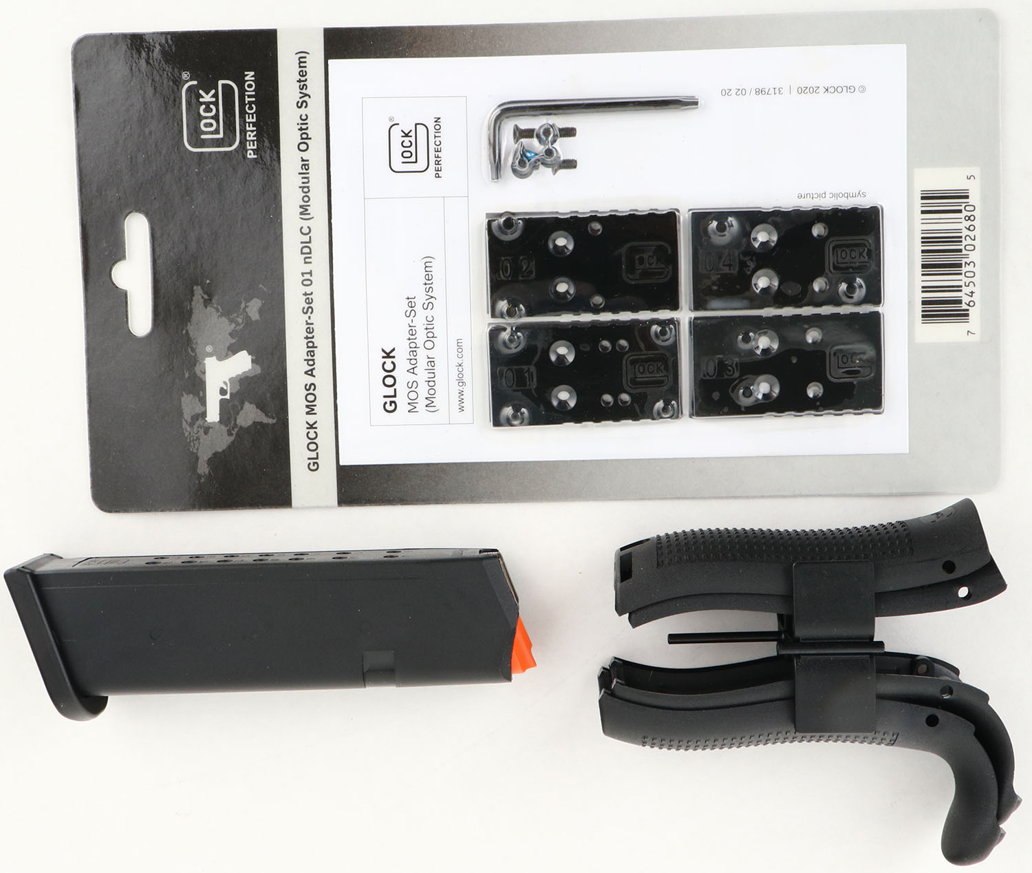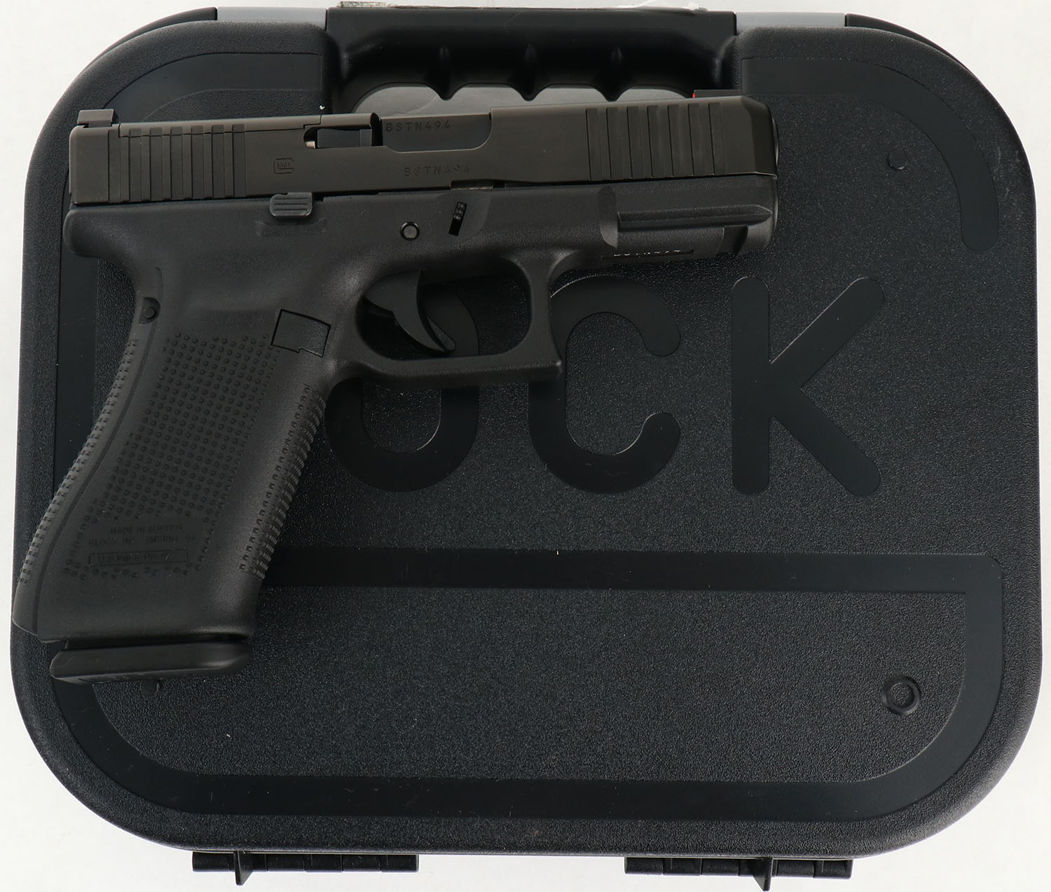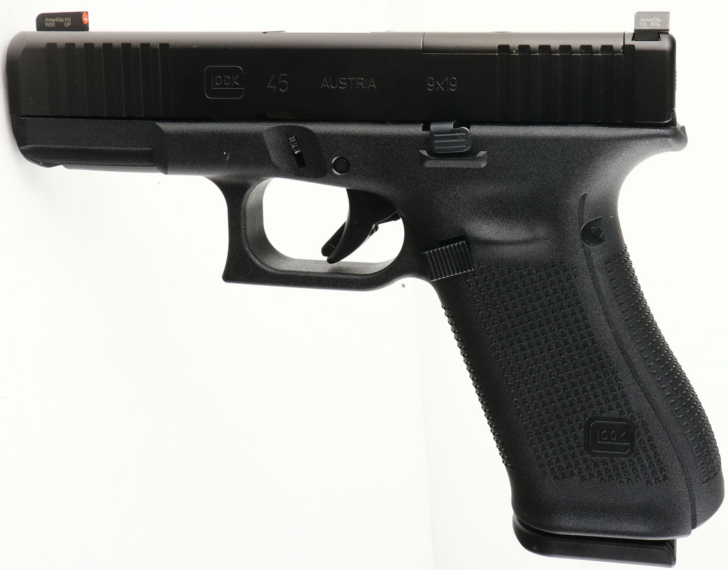 NEW CASED, Glock, Model 45 Gen 5 MOS, CAL: 9mm, MFG: Modern, Semi Auto Pistol, 4'' barrel. The textured polymer grip & frame are mint. The factory matte black finish is mint. Bore is mint. Factory rear two dot night sight & front dot night sight. Comes in factory hard case, with owners manual, lock/key, cleaning rod/brush, grip attachments, Glock MOS Adapter Set 01, (2) 17rd mags & speed loader & extra grip add ons. NOS. FFL Req. - Value: 500 to 650