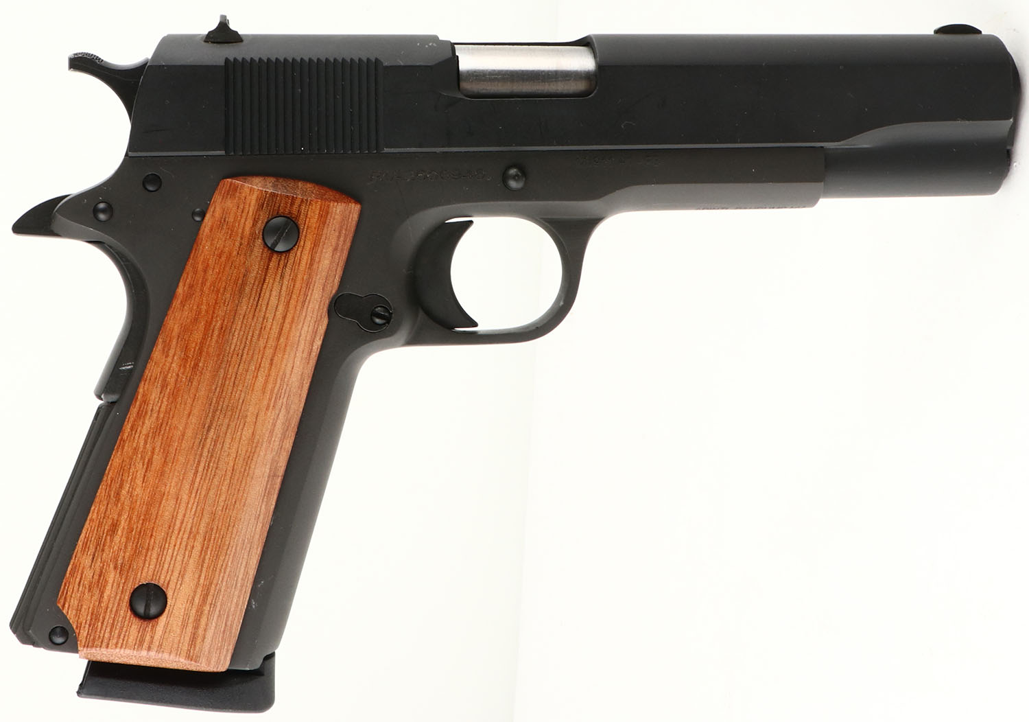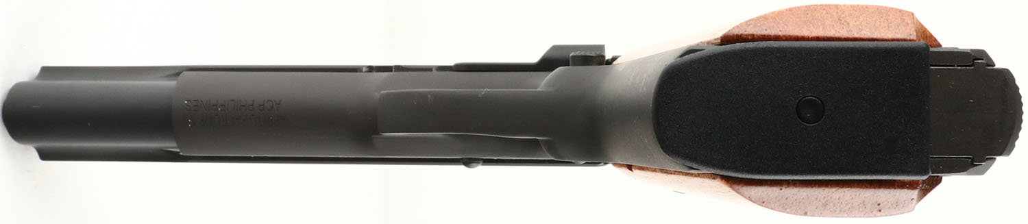Rock Island Armory, Model: M1911 A1 FS, Cal: .45 ACP, MFG: Modern, S/N: RIA2600946, Semi-Auto Pistol, 4 7/8'' barrel. The original, smooth wood grips are excellent, with a couple of minor dings on left grip. The the original matte metal finish rates 98%, with a few minor scuffs. Right side of frame is marked with S/N, ''M1911 A1-FS'', bottom of frame is marked ''APINTL-PAHRUMP NV'', ''ACP PHILIPPINES'', right side of slide is marked with the Rock Island Armory Logo. Bore is excellent, with very minor wear from light use. Slide holds a blade front sight, with a square notch rear sight. Comes with one 8 Rd. mag. FFL Req. - Value: 400 to 600