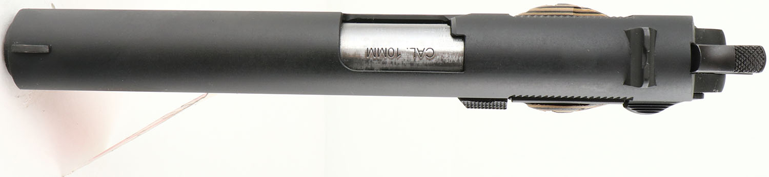 CASED, Rock Island, Model 1911A1-FS, CAL: 10mm, MFG: Modern, SN: RIA2445087, Semi Auto Pistol, 4 7/8'' barrel. The factory tan/black textured grips are excellent. The factory matte black finish rates 99%+ overall. Bore is excellent. Factory sights. Comes in factory hard case, with owners manual, test fire cartridge & lock/key. Gun store inventory, NOS. FFL Req. - Value: 600 to 800