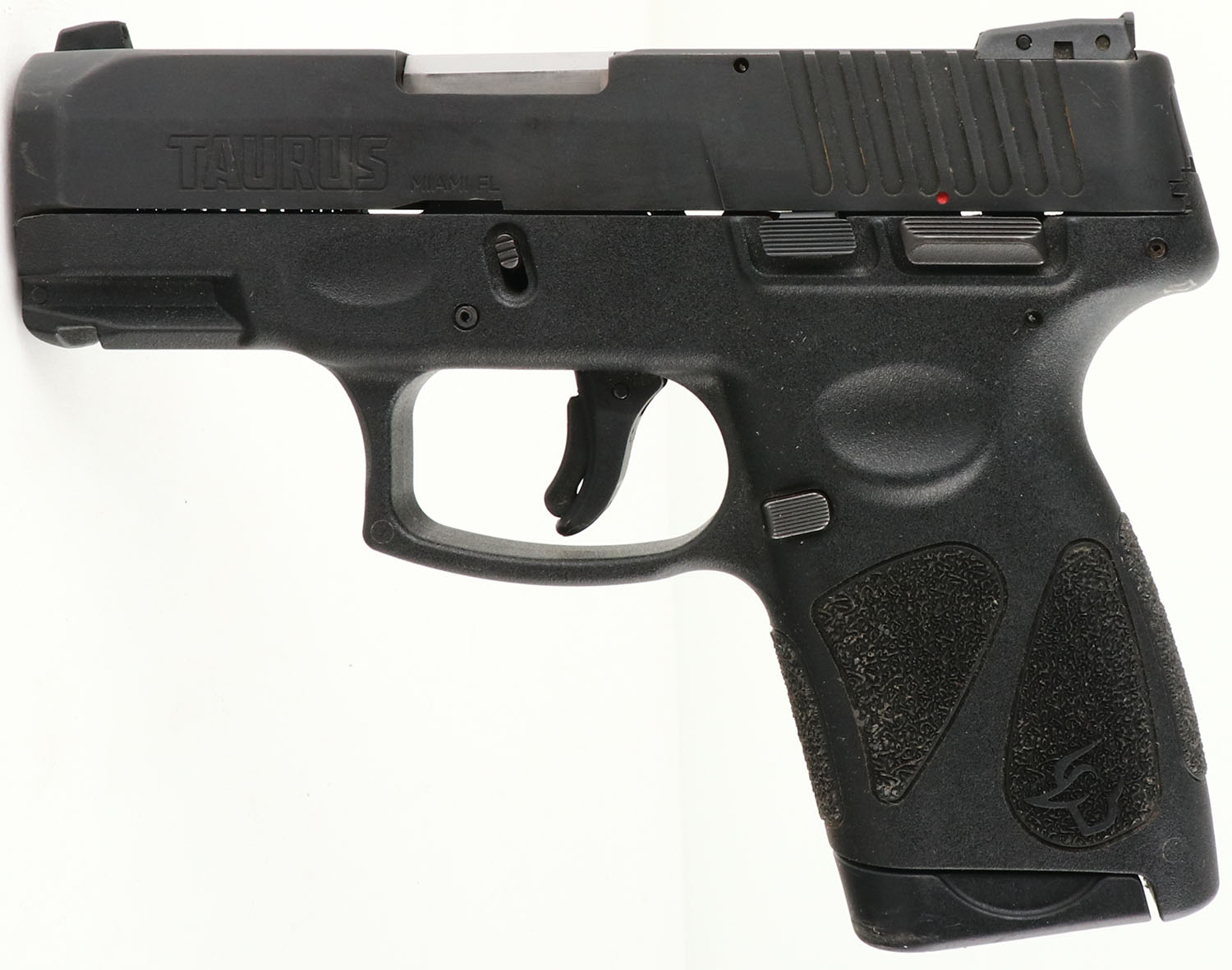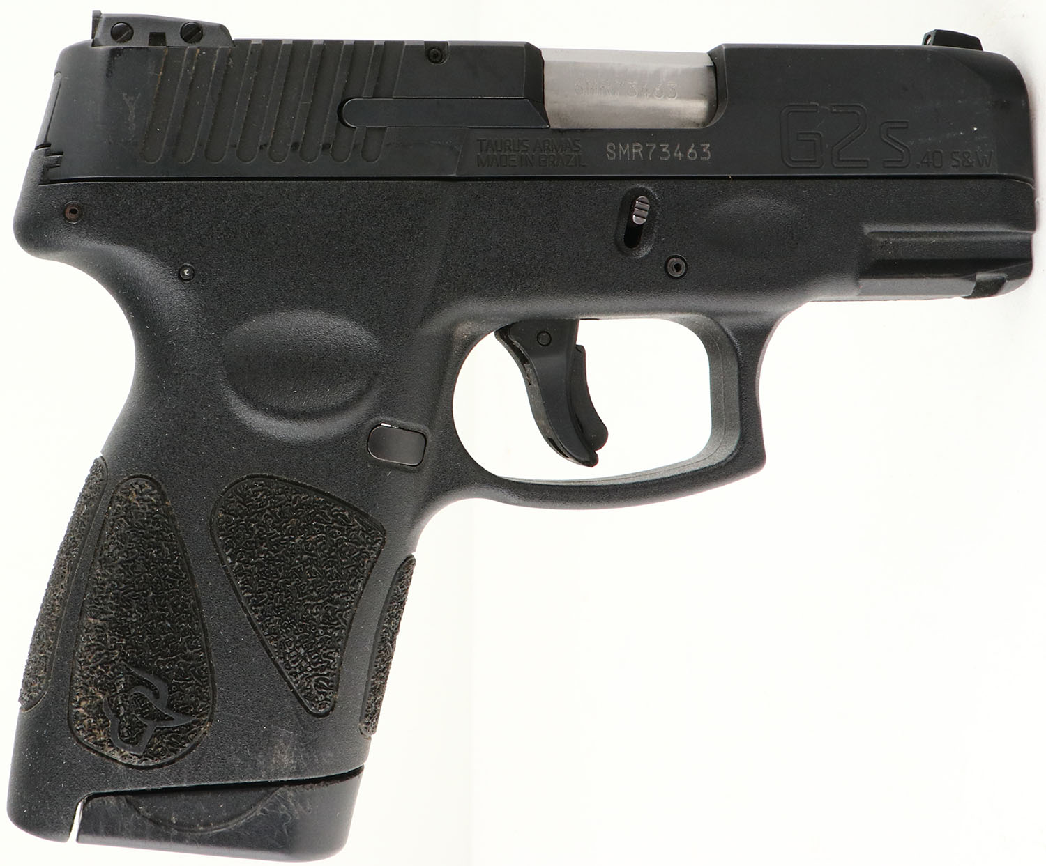 Taurus, Model: G2S, Cal: .40 S&W, MFG: Modern. S/N: SMR73463, Semi-auto Pistol, 3 1/8'' barrel. The checkered polymer frame is excellent with one small scuff. The black metal finish is excellent with light scratches. Bore is excellent. Factory white dot sights. Comes with one 6 Rd. mag. FFL Req. - Value: 100 to 200