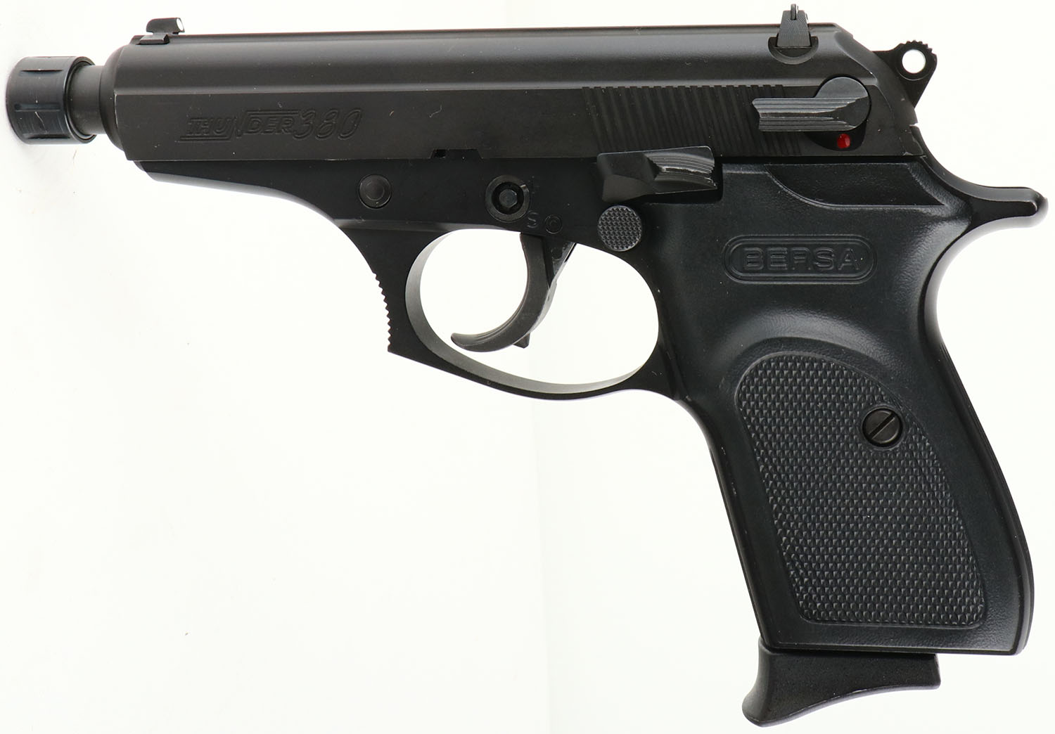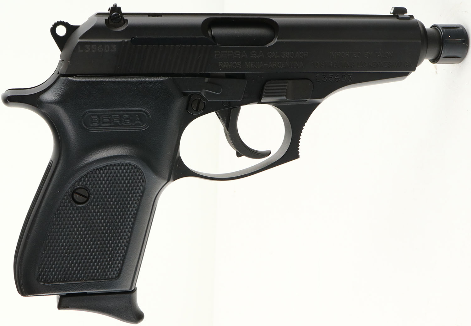 Bersa, Model: Thunder 380, Cal: .380 ACP, MFG: Modern, S/N: L35603, Semi-auto Pistol, 4 1/4'' Threaded barrel. The plastic, checkered, BERSA logo grips are excellent with no wear. The black metal finish rates 99%. Left side of slide is marked ''THUNDER380'', Right side of slide is marked with S/N, ''BERSA SA CAL 380 ACP'', ''RAMOS MEJIA-ARGENTINA'', & importer stamps, right side of frame marked with S/N. Bore is excellent with minor wear from light use. Slide holds a block white dot front sight & an adjustable two white dots square notch rear sight. Comes with one 8 Rd. Mag. FLL Req. - Value: 250 to 500