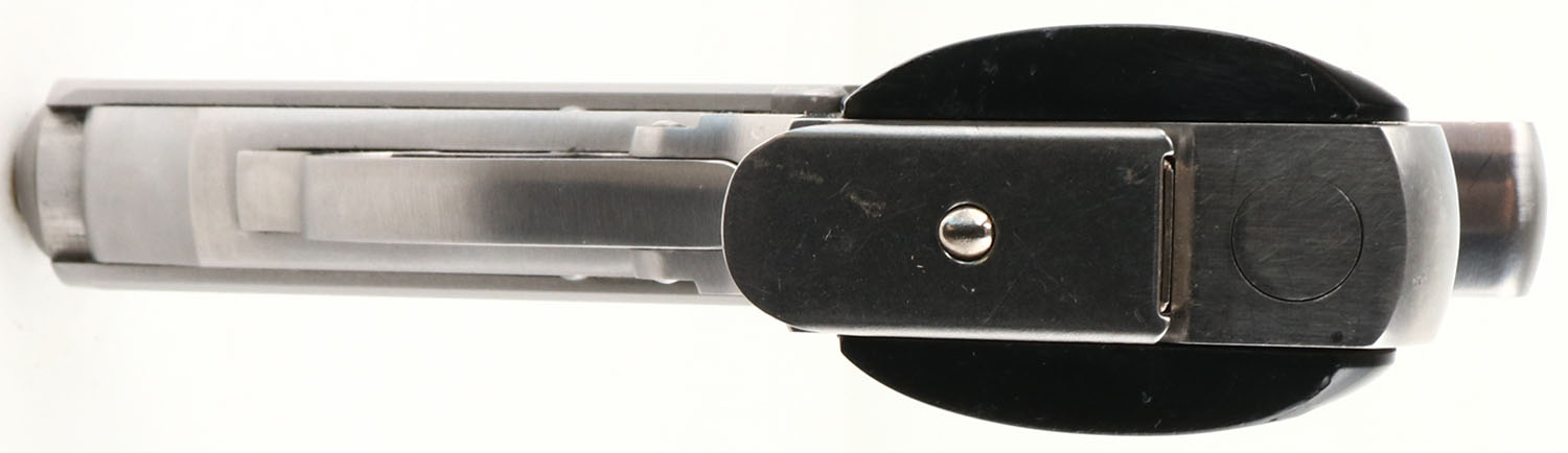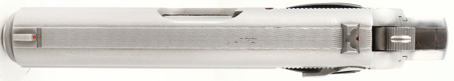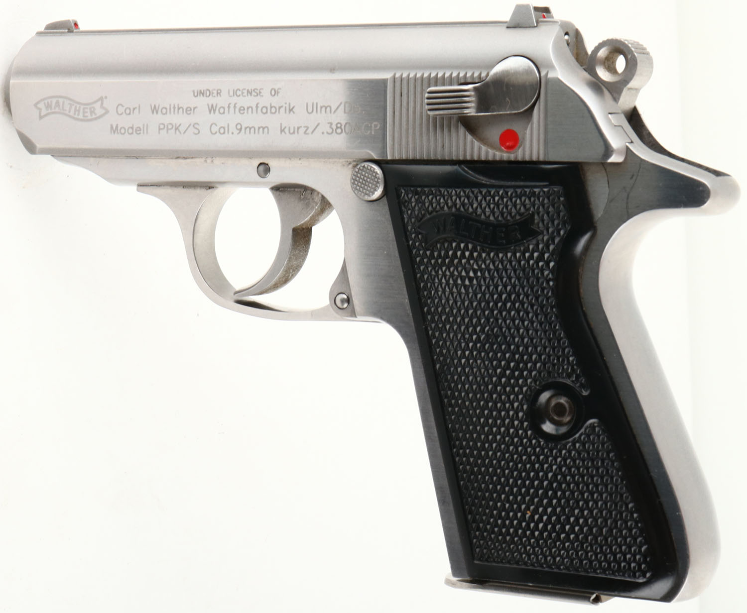Walther/Smith & Wesson, Model: PPK/S, Cal: .380 ACP/9mm Kurz, MFG: Modern, S/N: 6444 BAC, Semi-auto pistol, 3 1/8'' barrel. The plastic, checkered, Walther banner grips are excellent, showing almost no wear. The stainless steel is excellent, with some tiny surface scratches. Right side of slide is marked with the ''WALTHER'' banner, ''SMITH & WESSON'', ''HOULTON, ME USA'', left side of slide is marked with the ''WALTHER'' banner, ''UNDER LICENSE OF'', ''Carl Walther Waffenfabrik Ulm/Do.'', ''Modell PPK/S Cal. 9mm Kurz/.380ACP'', right side of frame is marked with S/N & model #. Bore is excellent with minor wear from light use. Slide holds a squared off blade front sight with red dot, & a square notch rear sight with a red square. Comes with one original ''Walther'' marked 7 rd mag. FFL Req. - Value: 400 to 600