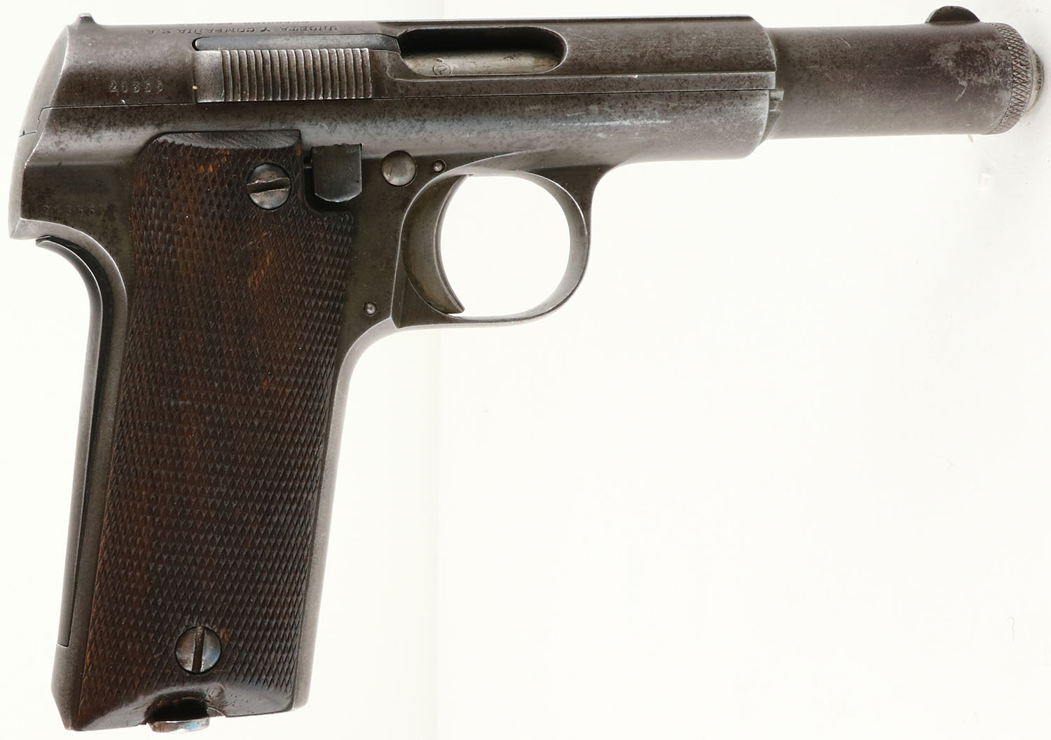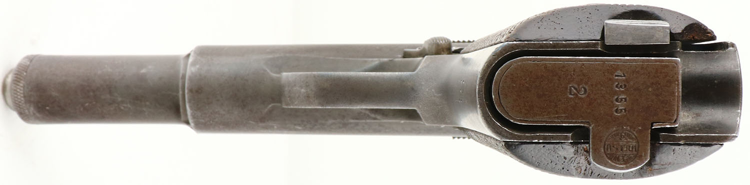 Astra, Model 600/43, CAL: 9mm Para, MFG: 1944, SN: 21355 Semi Auto Pistol, 5 1/4'' barrel. The original checkered walnut grips are excellent, with a couple minor scrapes & dings. The metal blue finish has worn to a mix of metal gray & a thin spotty layer of a brown patina. Bore is excellent. The slide has a fixed notch rear sight & blade front sight. SN matching Astra marked detachable mag, which is extremely rare to still retain the original SN matching mag. The front grip strap is property stamped ''LBPN'' (Landesbereitschaftspolizei Niederschsen), which was the postwar Lower Saxony Barracked Police. Missing Lanyard loop. In late 1943, examples of the newly designed Astra 600 were sent to Germany & were approved for issue to German armed forces, receiving the designation Pistole Astra 600/43. The Astra 600's that could not be delivered to the German government during World War II were then stored by the Spanish government. Small quantities of pistols were sold to Turkey, Portugal, Chile, & Costa Rica until 1951, when the remaining Astra 600's were sold to West Germany. Those pistols were extensively used by West German police forces until the late 1960's when Interarms purchased the remaining pistols for export to the United States civilian market. FFL or C&R Req. - Value: 250 to 450