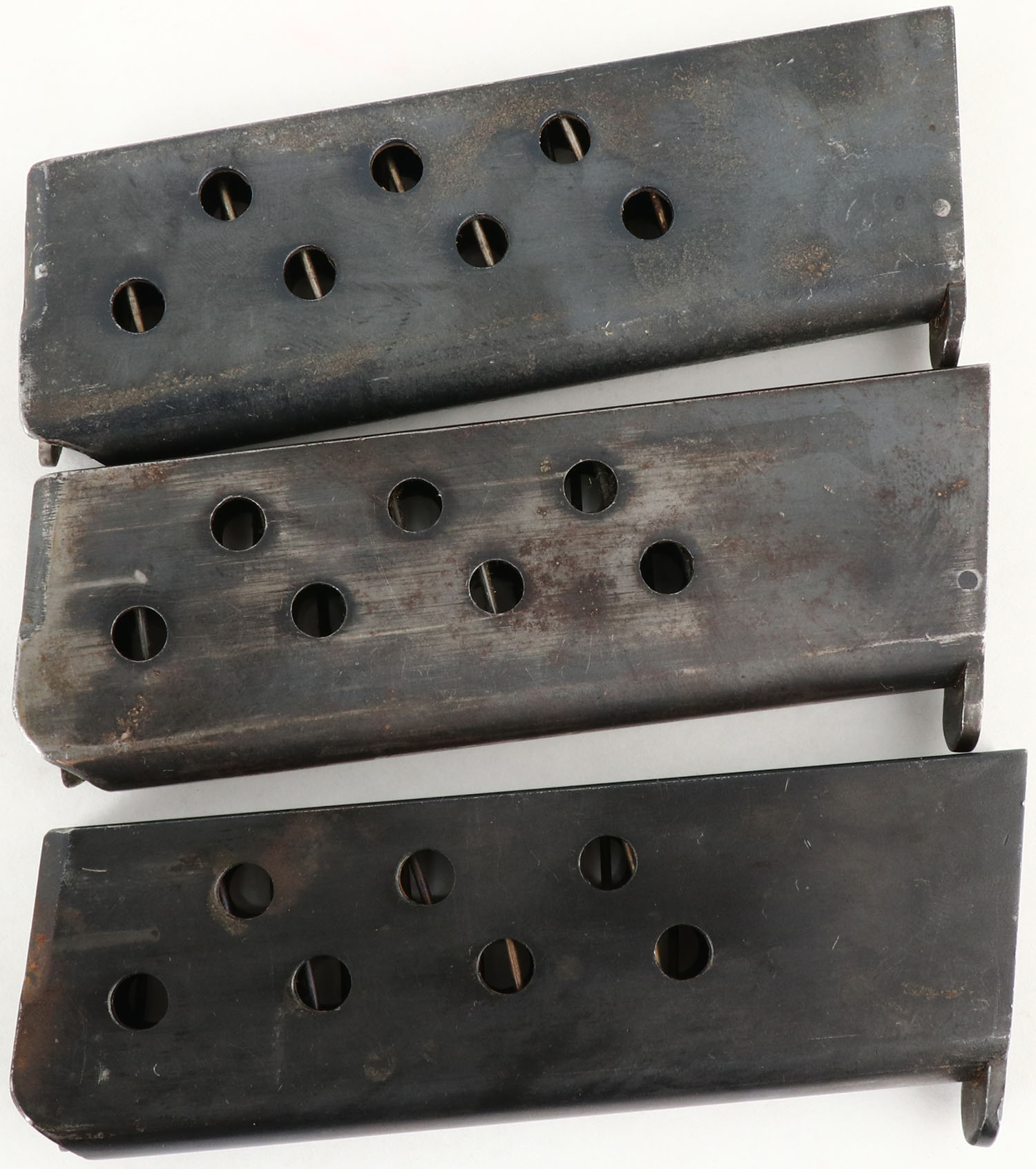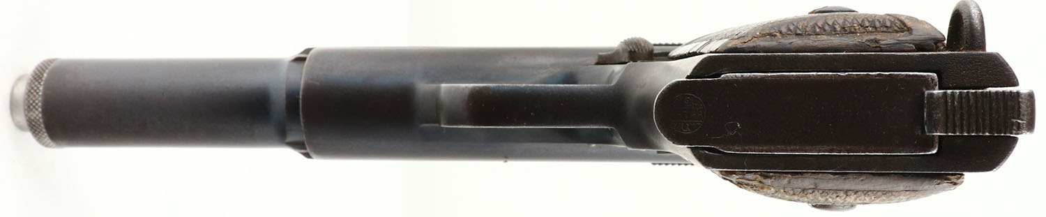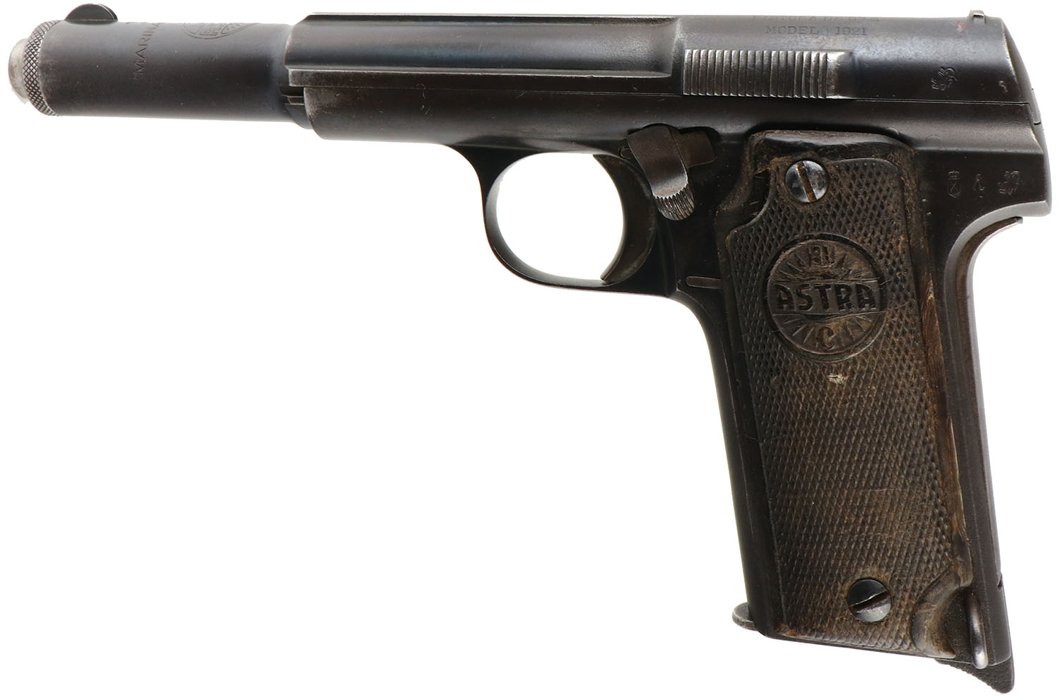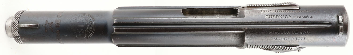 Astra, Model 1921/400, Chilean Navy Pistol, CAL: 9mm, MFG: 1921-50, SN: 36496, Semi Auto Pistol, 6'' barrel. This pistol was the standard issue sidearm in the Spanish Army during the Spanish Civil War & also saw service in Germany during World War II. Designed to be safe to fire with a simple blowback action unaided by any breech-locking devices. This pistol carries all the original markings & proofs. Additionally, the top of the barrel is marked ''MARINA DE CHILE'' under a star. The original Astra logo checkered grips are good, worn from use & have color fading, nicks, dings & multiple small edge cracks. The metal blue finish has 90% coverage of a mix of original blue & brown patina, with small areas of cleaned pitting. Most of the finish loss found on the front & back straps. Bore is excellent. The slide holds notch & blade sights. Comes with an aftermarket hard case that includes (3) mags & a cleaning rod. FFL or C&R Req. - Value: 200 to 400