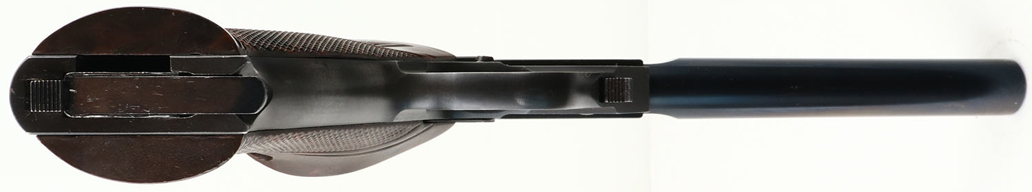 High Standard, ''Field King'', CAL: 22LR, MFG: 1953, SN: 419646, Semi Auto Pistol, 6 3/4'' barrel. The original HS checkered plastic grips, with thumb rest, are excellent. The original metal blue finish rates 95% overall. Bore is excellent & bright. The slide carries an adjustable rear sight & the barrel has a serrated blade front sight. Comes with an extra barrel (4 1/2'') marked ''FLITE KING'', a boxed original High Standard magazine & George Lawrence leather holster that also holds a 3rd non-marked mag. FFL or C&R Req. - Value: 300 to 600