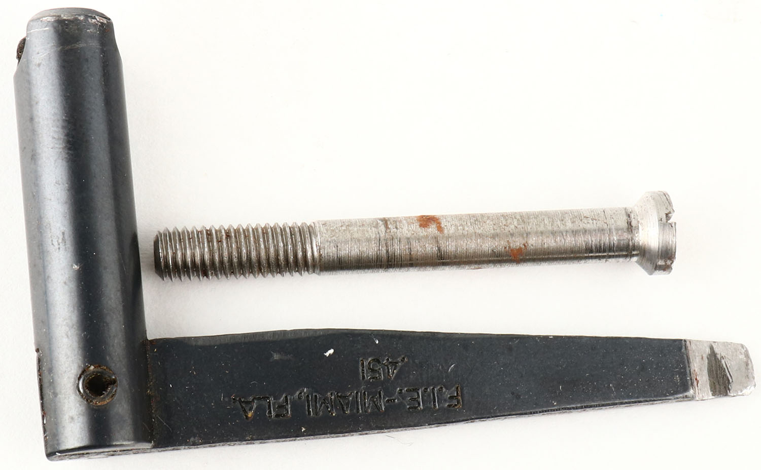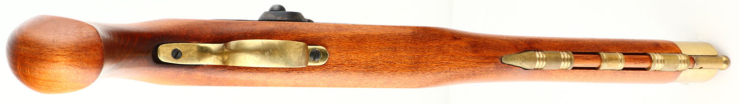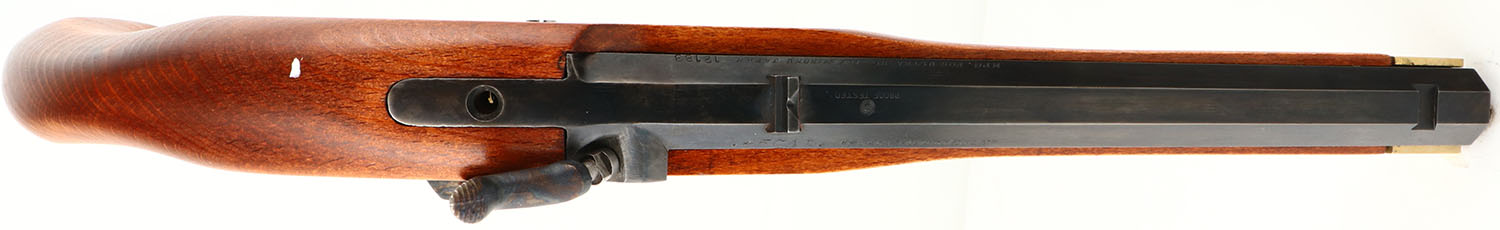 BOXED, Ultra-Hi, Replica Kentucky Pistol Kit (Model 7090K), Mfg. by Miroku in Japan, CAL: 45, MFG: Modern, SN: 12183, Percussion Muzzleloader Pistol, 9 1/8'' barrel. The one piece wood grip is excellent. The metal blue finish on the barrel rates 99%. The case-hardened side plate & hammer display vivid case-colors. The brass components have a thin aged patina, with some oxidization on the left side plate. Bore is excellent, with minor spotting at the muzzle. The barrel holds a fixed notch rear sight & open front dovetail. There is a brass front sight blank missing the bead in the box. Ramrod present. Comes in original box, with tool, extra body screw & documents. Black Powder, No FFL Req. - Value: 100 to 200