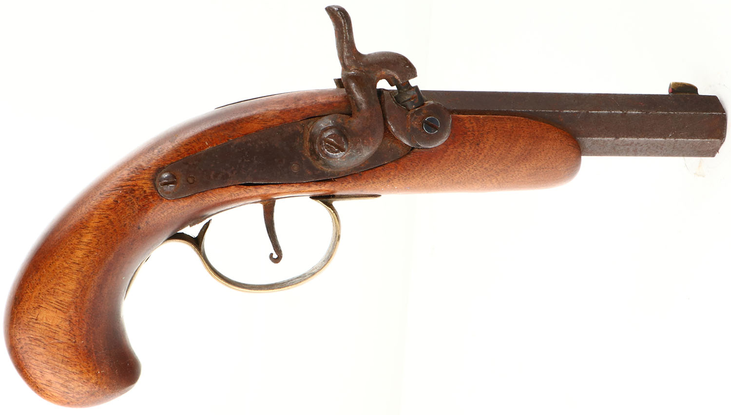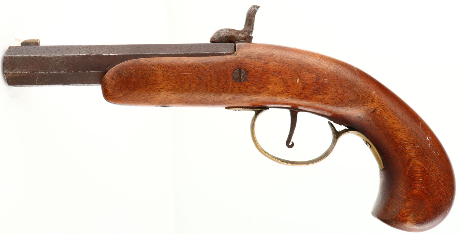 Unknown, Percussion Pistol, CAL: .42 cal, MFG: unknown, SN: NSN, Single Shot Black Powder Muzzleloader Pistol, 7 1/2'' octagon barrel. The original wood stock is excellent, with inlaid ebony at the forend tip. There are few tiny contusions to the original finish. The metal finish has fully toned to a brown patina, with rust speckling. Bore has good rifling, but with lots of brown rust pitting. The barrel holds a fixed notch rear sight & small blade front sight. All appears to function properly. Black Powder. No FFL Req. - Value: 50 to 200