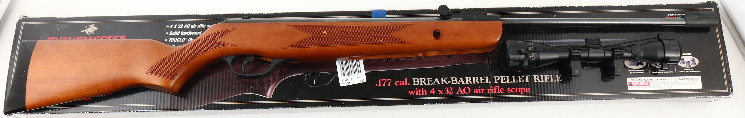 Winchester, Model 1028WS, .177 Caliber Pellet Rifle, Single Pump Break-Barrel, 1000 FPS, 19'' Barrel, Checkered Wood Stock, 4x32 Air Rifle Scope, Scope is minty and comes with lens covers & rings, bore is minty, comes in original box with manual & sling. Grade: Excellent ++ - Value: 50 to 150