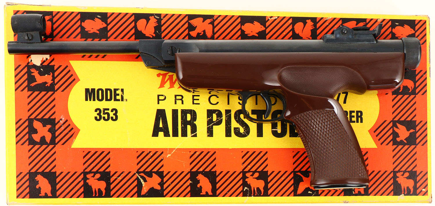 Winchester, Model 353, Precision Air Pistol, 177 Caliber, Single Pump Break-Barrel, 7 1/8'' Barrel, checkered brown plastic stock/grip, adjustable standard rear sight, hooded front sight blade, bore is excellent, comes with original box & manual. Grade: Excellent ++ - Value: 40 to 120