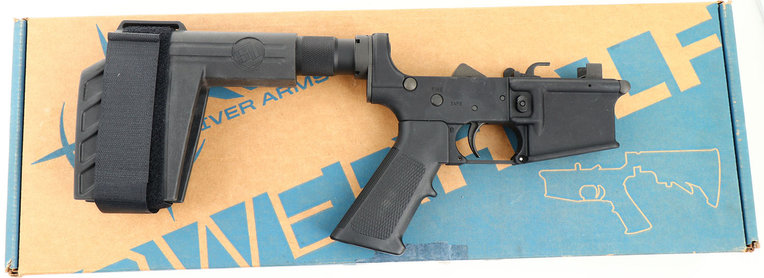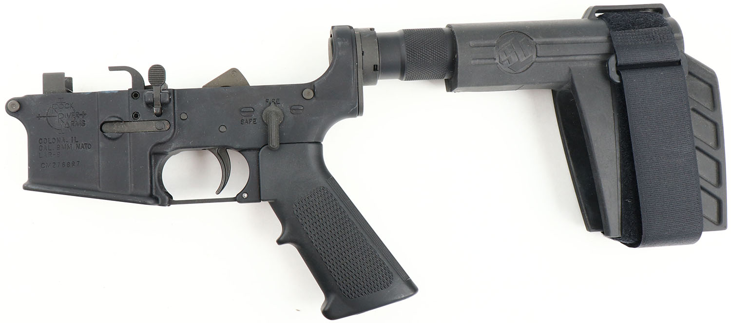 Boxed, Rock River Arms, LAR-9 lower receiver, PARTS GUN, Cal: 9x19mm, MFG: Modern, S/N: CM276897, Semi-Auto AR lower. The plastic, checkered A2 style Pistol grip is excellent, SB tactical Pistol brace is excellent. The black metal rates 99% with very minor wear/scratches from handling. NIB never sold to the public from a gun store. PARTS RIFLE SOLD ''AS-IS, WITH NO RETURNS. FFL Req. - Value: 300 to 400