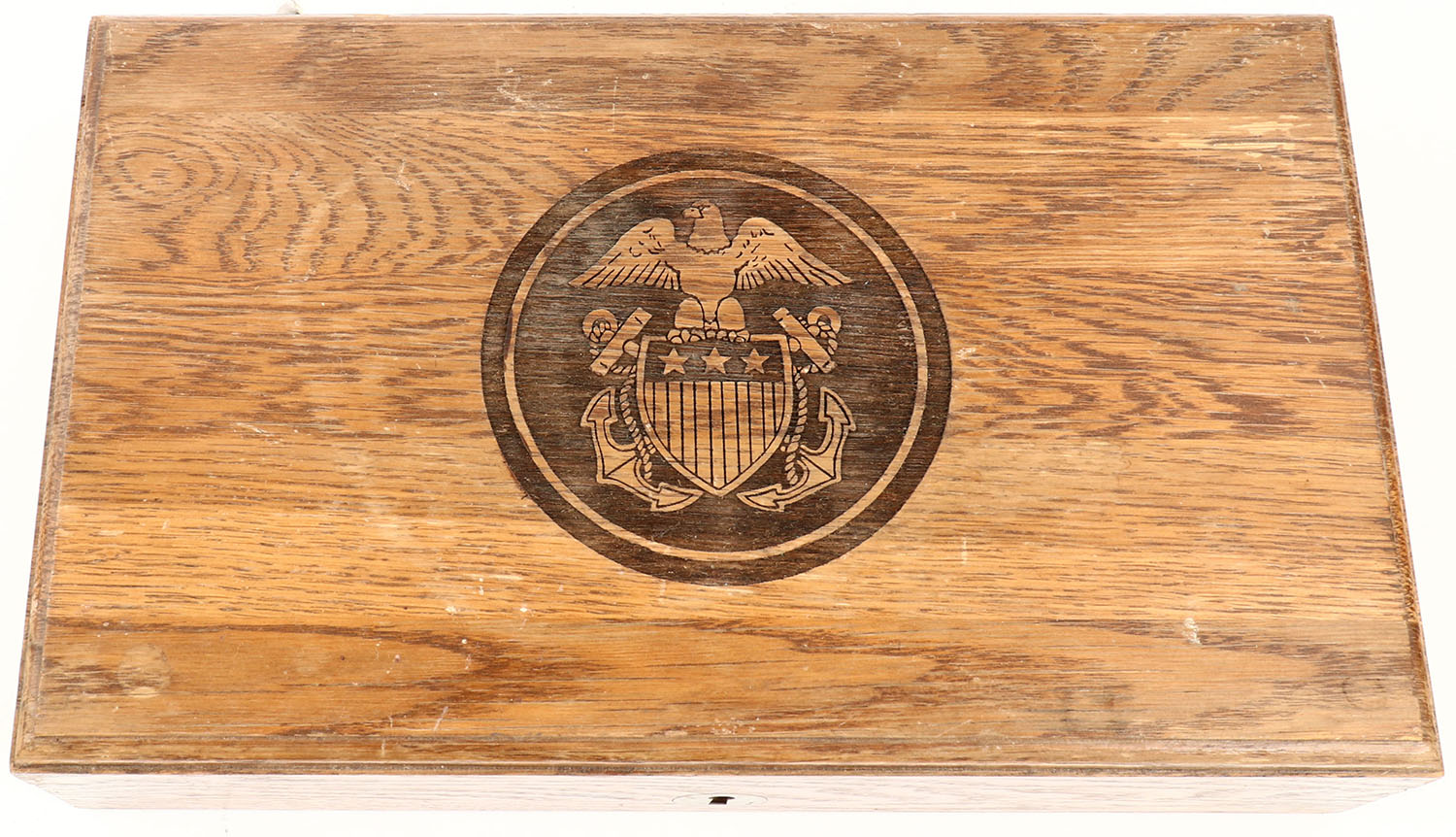 Empty wood pistol case with navy logo on top, inside has a brass plaque marked ''JUDGE ''L'' WIGHTMAN ADCS, U.S. NAVY AUGUST 1933 - MARCH 1966:, 14'' long. Grade: Very Good ++ - Value: 10 to 60