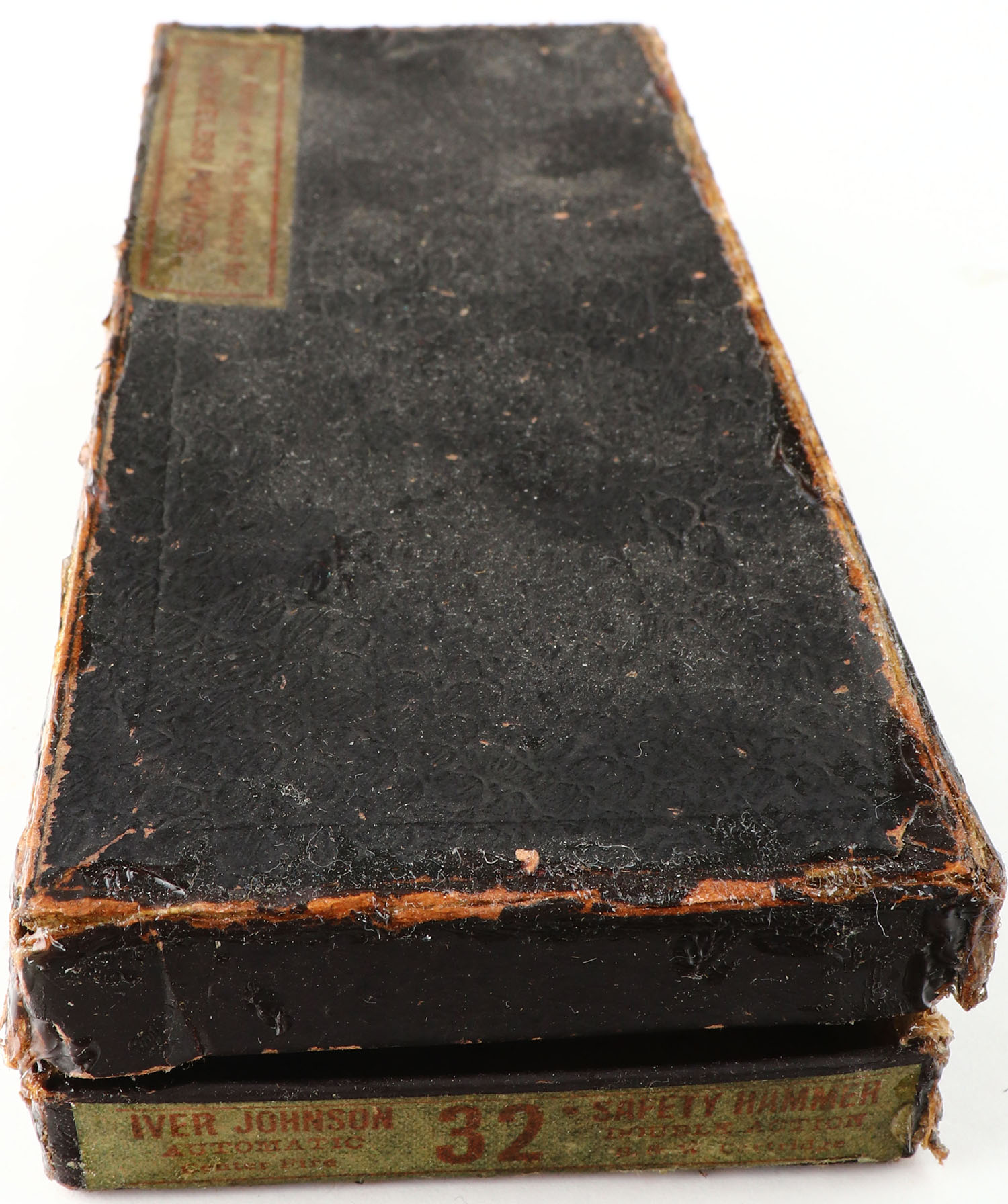 BOX ONLY: Iver Johnson Original factory two piece cardboard box for Iver Johnson Safety Hammer Automatic Double Action Revolver. End label & top label intact. Interior lid has picture of the revolver & description. Box edges & corners have been glued to repair & add structure. Condition is fair to good. Rare factory box. - Value: 10 to 100
