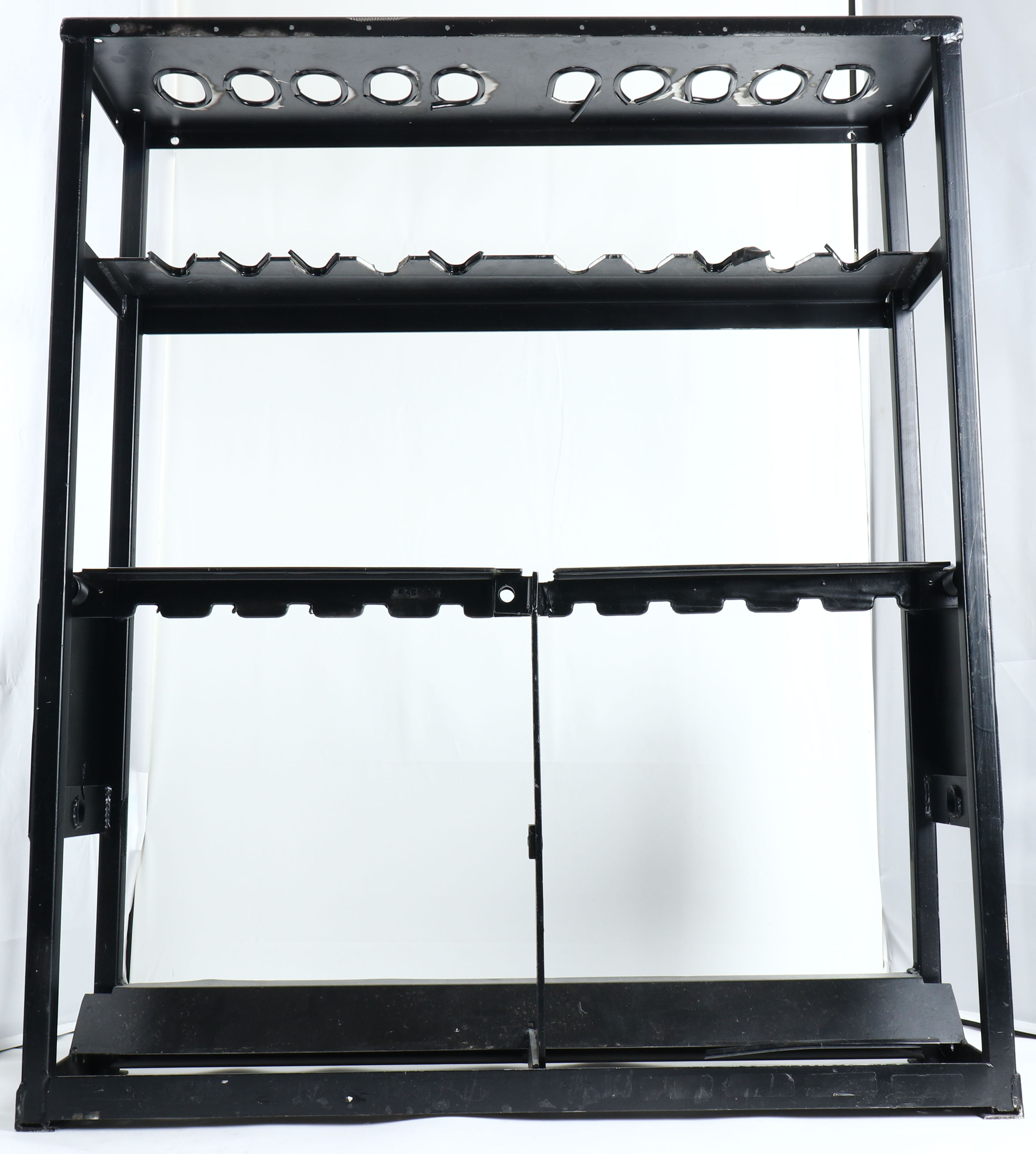 U.S., M12 Small Arms Storage Rack: Originally designed in the 1960's for the M16, but is still used today by the military. Has locking arms to lock guns into place. Able to hold up to 10 long guns. Dimensions: 42'' H x 36'' L x 10'' W. Due to size, ship cost will be high on this item. Grade: Very Good++ - Value: 80 to 250