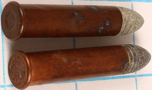 Lot of 2. .38 Extra Long Rimfire (1.5'' case). (1) Raised ''H'' in impressed circle. (1) Impressed ''U''. Grade: Excellent - Value: 20 to 30