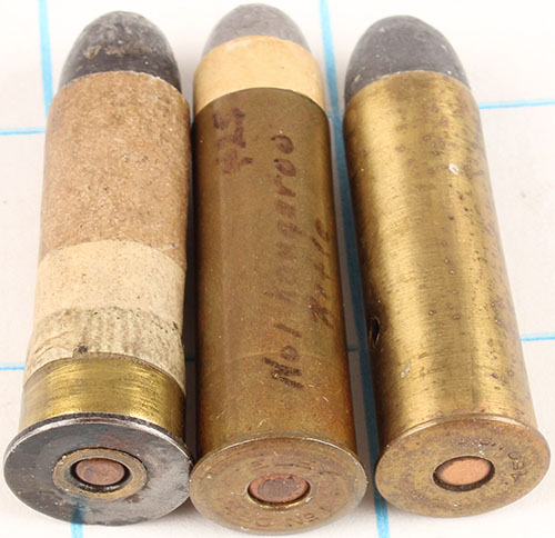 Lot of 3 Variations (1) H/S= ''ELEY 450 No 1'' 1 1/2'' CL. Small oval copper primer RNL. Brass tube, 1-case hole dummy (1)H/S= ''ELEY 450 No 1'' 1 1/2'' CL. Oval copper primer, PP RNL. Copper tube (1) N/H 450 No 1 1 1/2'' paper coiled brass, brass base, battery cup, flat copper primer, RNL. Grade: Very Good ++ - Value: 60 to 120