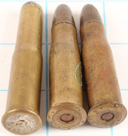 Lot of 3 SCARCE Headstamps H/S= (raised) ''B&M KC 16'' 10.4x47 R Vetterli, SM. Oval COP. PRL., F.P. G.M. R.N. H/S= ''S.F.I. Milano Leon Beaux & Co.'' 10.4x full length CS, Vetterli multi-ball, SM. Oval COP. PRL. RND. LD. Ball H/S= (raised) B&M KC 17 10.4x47 R Vetterli, SM. Oval COP. PRL., F.P. G.M. R.N. Grade: Very Good + - Value: 60 to 120