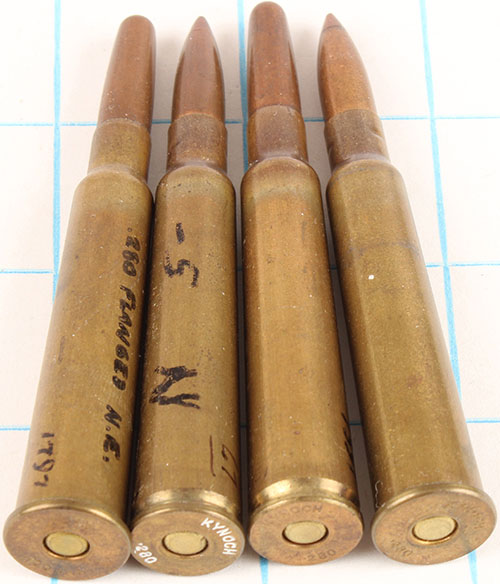 Lot of 4. (2) 280 Ross., (2) 280 Flanged. All HS:''KYNOCH 280'', (2) PT CJ FMJ (one of each caliber). (2) FN CJ Hollow point (one of each caliber). Grade: Excellent - Value: 20 to 40