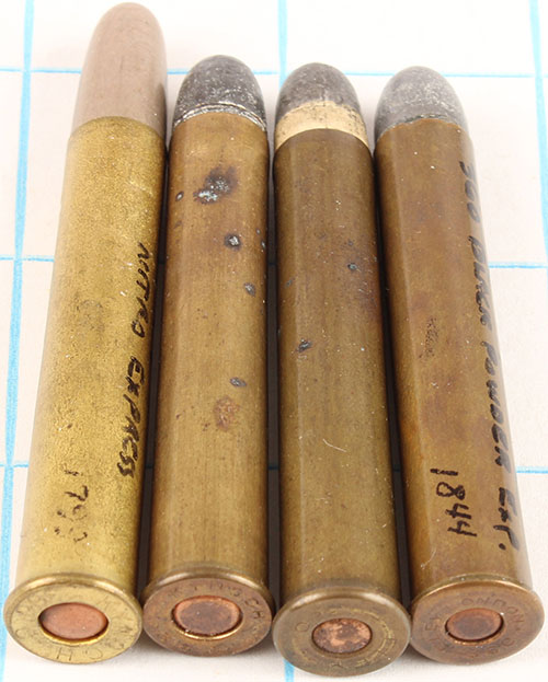 Lot of 4. .360 x2.25'': (1) HS:''KYNOCH .360'', RN lead w/ small hollow point. (1) HS:''KYNOCH C 360'', RN CN FMJ. (1) HS: ''ELEY 360'', FN PP Lead w/ copper tube. (1) HS: ''ELEY LONDON 360'', FN Lead w/ copper tube. Grade: Excellent - Value: 20 to 50