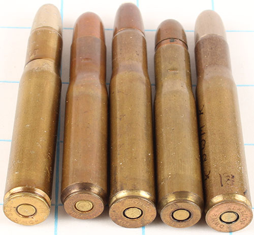 Lot of 5. (3) 404 Nitro. (1) HS:''DWM k 10,75x73 k'', CN RN SP. (1) HS:''KYNOCH 404'', RN CJ SN. (1) HS:''t DWM 556 t KAL 404'', RN CN FMJ (2 holes in case). (2) 425 Westley Richard Magnum. (1) HS:''WR 425 K'', RN CJ FMJ. (1) HS:''WR 425 K'', RN CJ FMJ (extra cannelure on bullet). Grade: Excellent - Value: 20 to 50