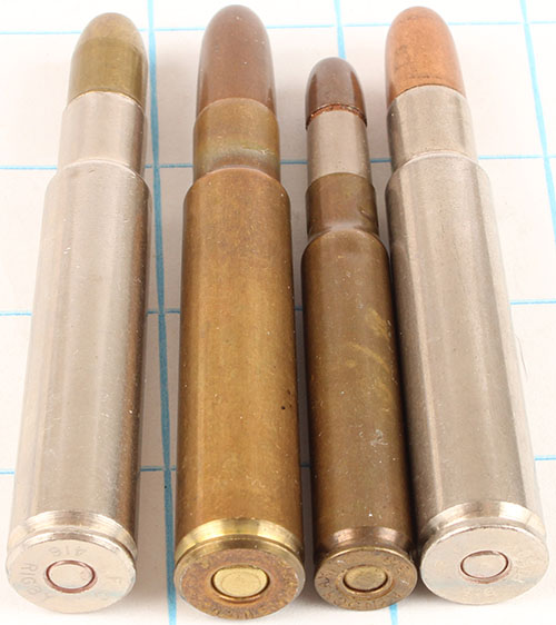 Lot of 4. 416 Rigby: (1) HS: ''RIGBY 416 NITRO K'', RN CJ FMJ. (1) HS:''F C 416 Rigby'', CJ RN FMJ. (1) HS:''''F C 416 Rigby'', FN CJ FMJ. 318 Nitro: (1) HS:''KYNOCH AXITE 318'', RN LT #2 copper capped. Grade: Excellent - Value: 20 to 40