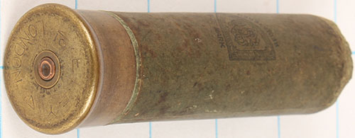 H/S= ''ELEY LONDON No. 4ga'' 4'' OAL. fired empty green paper case. Grade: Very Good + - Value: 10 to 50