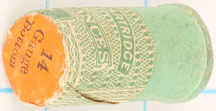 Early Eley's wire and concentrator shot loads. The Eley Brothers began designing shot in the 1800s in London and the company is still in business today and located in Birmingham. Civil Wire Paper wrapped Eley 14 gauge wire shot shell. Base of the cartridge is marked: 14 / GAUGE on an orange tag. Grade: Excellent - Value: 10 to 60