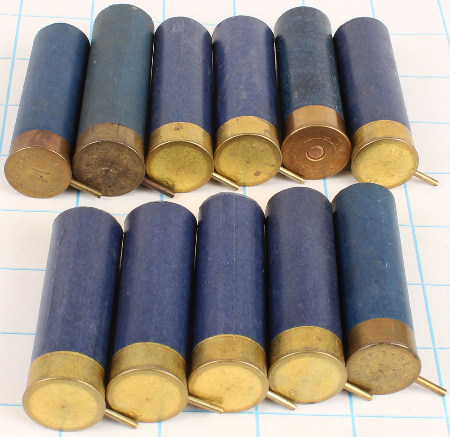Lot of empty pinfire shotshells, 1 centerfire, 10 pinfire in blue paper cases. Grade: Very Good ++ - Value: 10 to 50