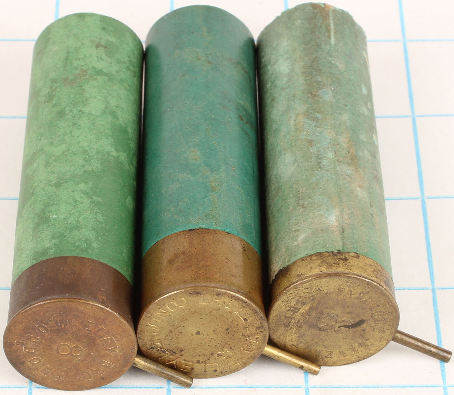 Lot of 3 empty pinfire, mixed H/S, 8 ga, green paper cases, 3 1/4'' OAL. Grade: Vey Good ++ - Value: 10 to 50