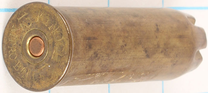 H/S= ''KYNOCH 12 ga NITRO BALL'' 2 5/8'' OAL, loaded brass shotshell. Grade: Excellent - Value: 6 to 50