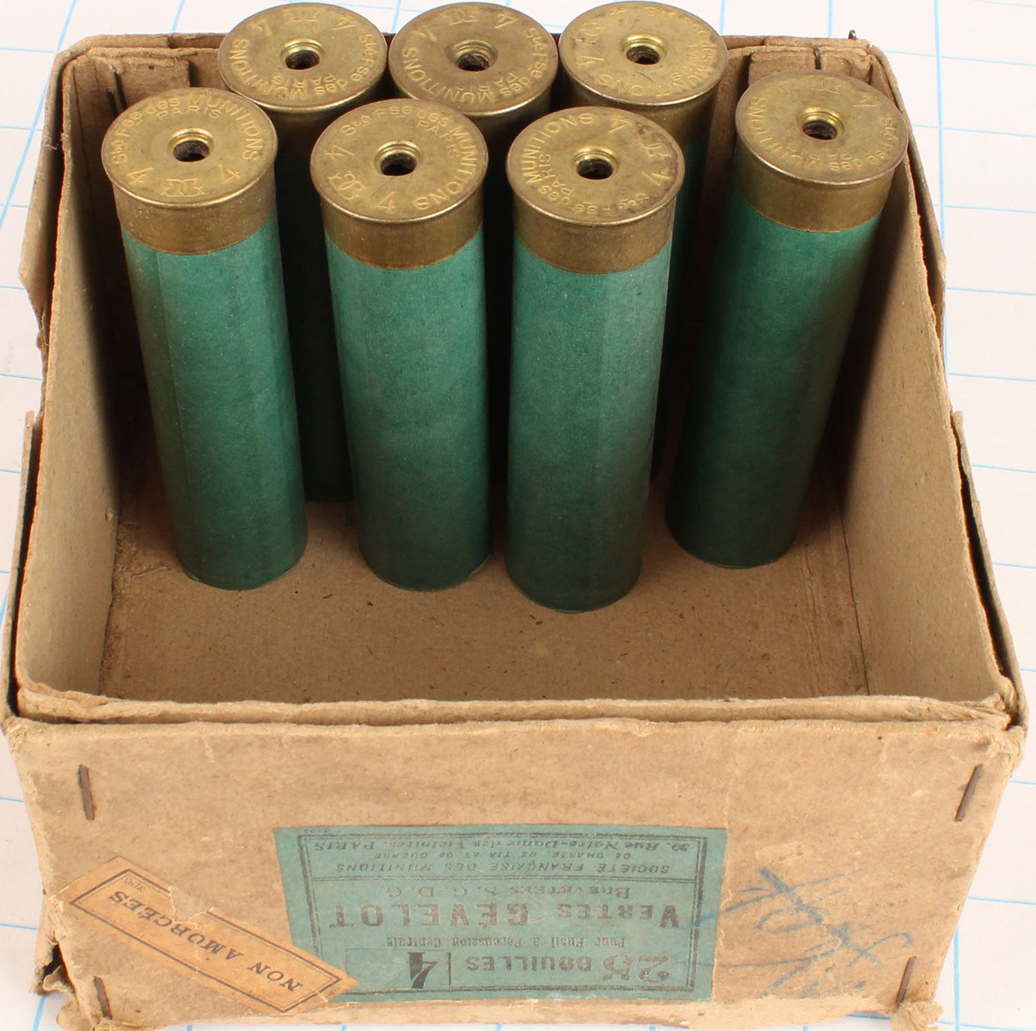 Lot of 7 H/S= ''Ste Fse des Munitions Paris 4 ga'' 3 15/16'' OAL. In original box, empty green paper cases. Grade: Very Good ++ - Value: 2 to 100