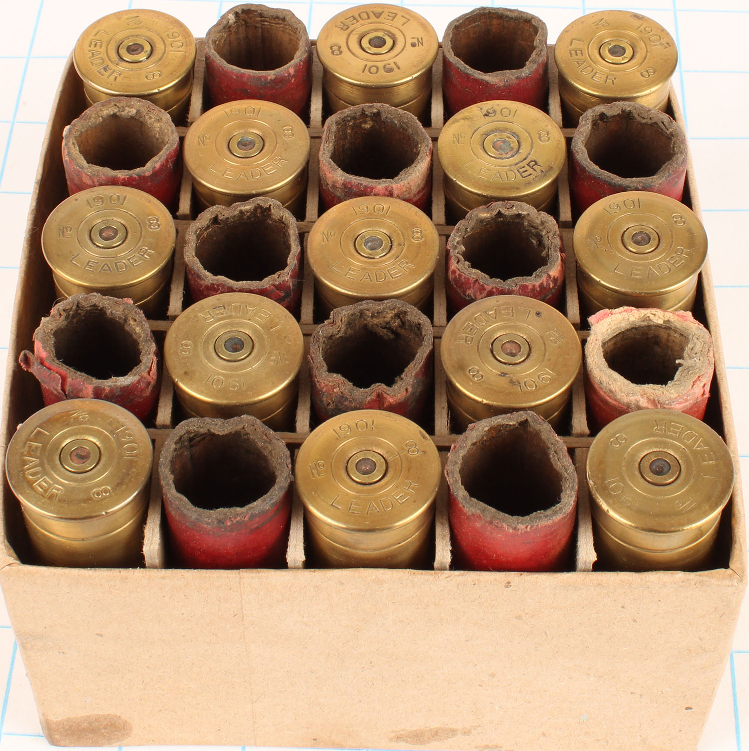 Large lot of 25 H/S= ''1901 Leader No 8'' 3 3/16'' OAL. All fired empties, red paper cases. Grade: Very Good - Value: 2 to 100