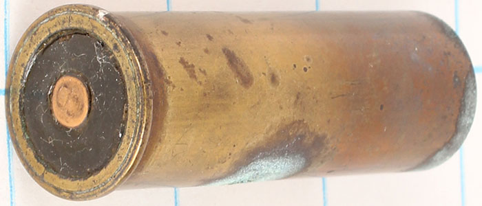 H/S= none,, 20ga, empty brass, new primed, N.P.E. 2 1/4'' OAL, has hole drilled on side. Grade: Very Good ++ - Value: 6 to 30