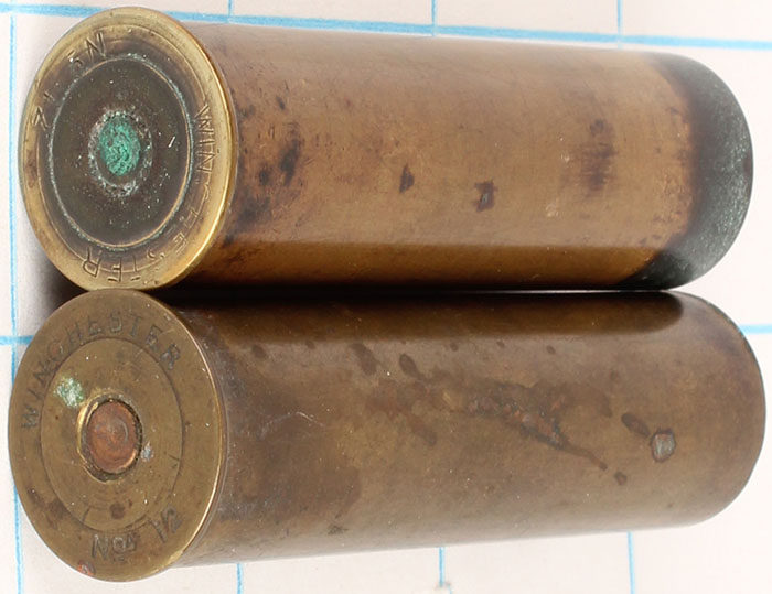 Lot of 2 H/S= ''Winchester 12ga, N.P.E. brass shotshell. Grade: Very Good + - Value: 6 to 30