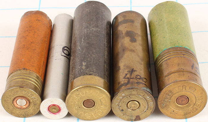 Lot of 5 (1) ''Winchester Repeater 20ga'', N.P.E. yellow paper, 2 1/2'' OAL. (1) ''U.S.C.CO. Lowell No 12'', N.P.E. black paper, 2 3/4'' OAL. (1) ''Winchester 16ga'', empty brass, fired empty, 2 1/2'' OAL. (1) ''Winchester Pigeon No 10'', N.P.E. green paper, 2 5/8'' OAL. (1) ''WCC 53 410 M35 PRI, 2 3/4'' OAL. Grade: Very Good ++ - Value: 6 to 30