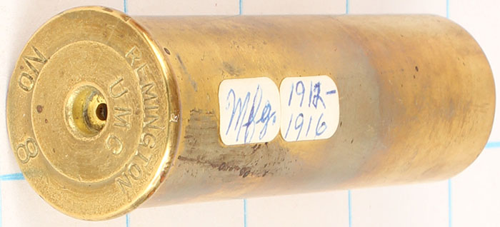 H/S= ''REMINGTON UMC No 8'' 2 15/16'' OAL, unprimed empty brass, VERY SCARCE HEADSTAMP 1911-1916. Grade: Excellent - Value: 6 to 30