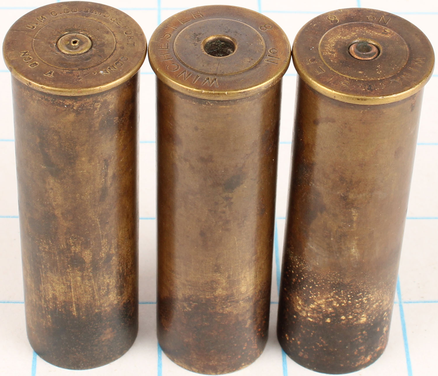 Lot of 3, mixed H/S, 8ga, 3'' OAL, empty brass shotshells. Grade: Very Good - Value: 10 to 50