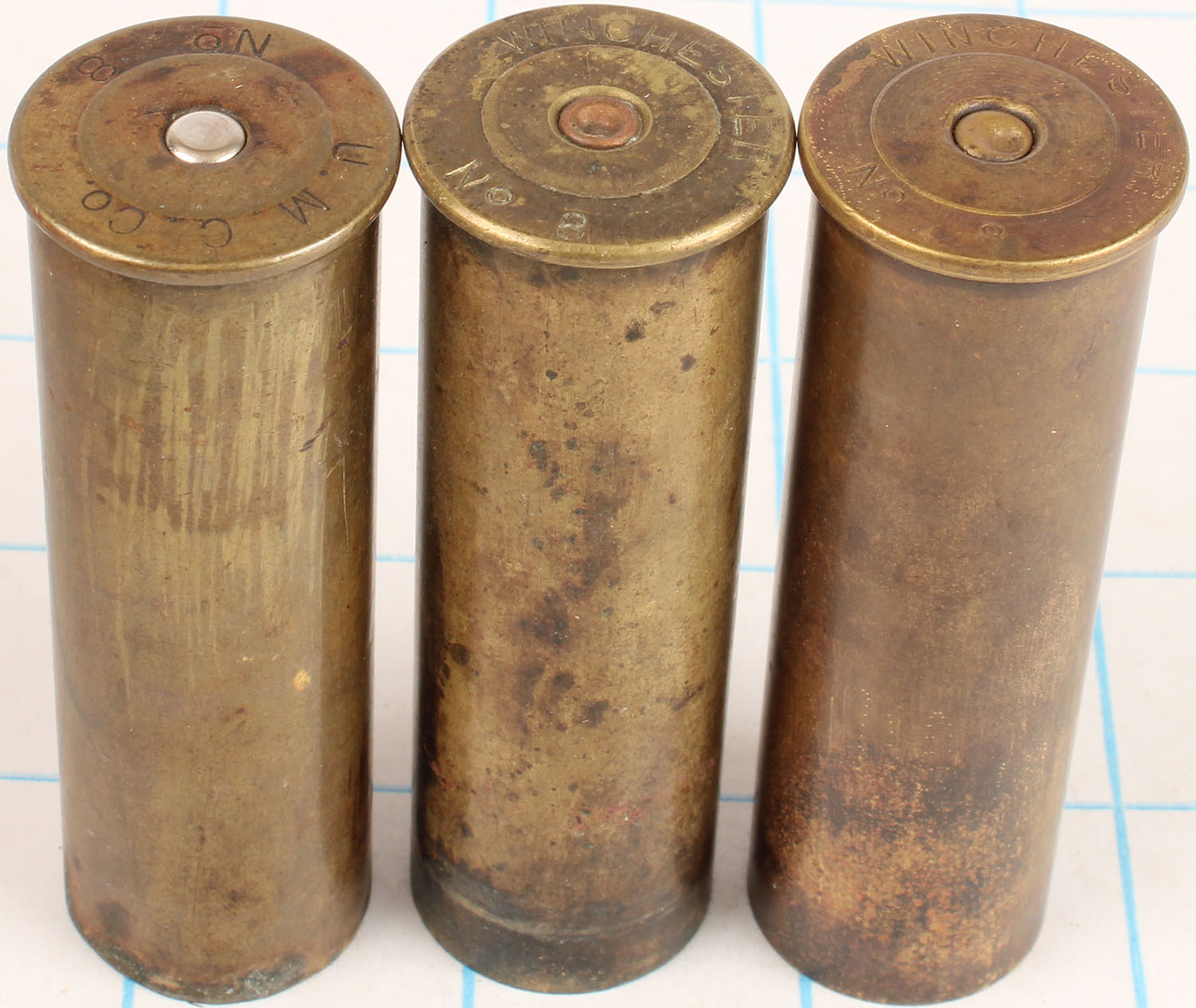 Lot of 3, mixed H/S, 8ga, 3'' OAL, empty brass shotshells. Grade: Very Good - Value: 6 to 30
