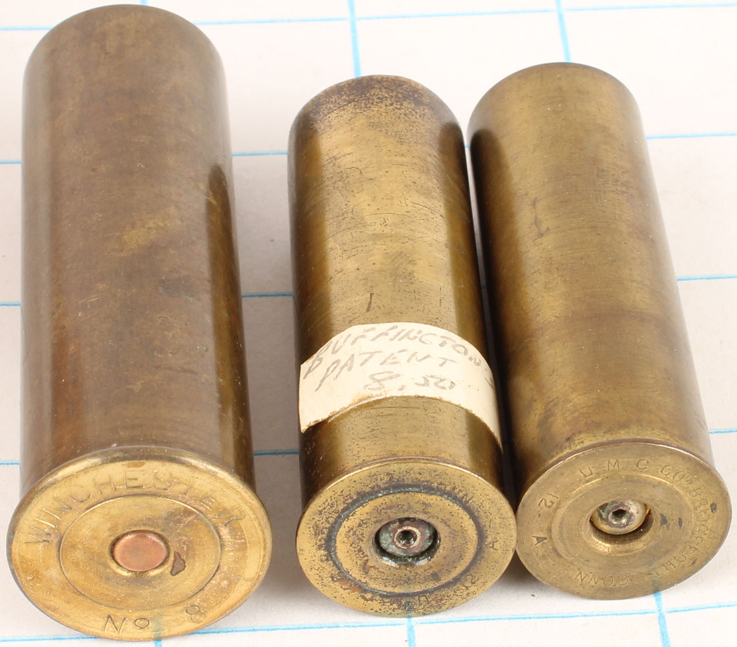 Lot of 3 empty brass shotshells, mixed H/S, mixed gauges. Grade: Very Good ++ - Value: 6 to 30