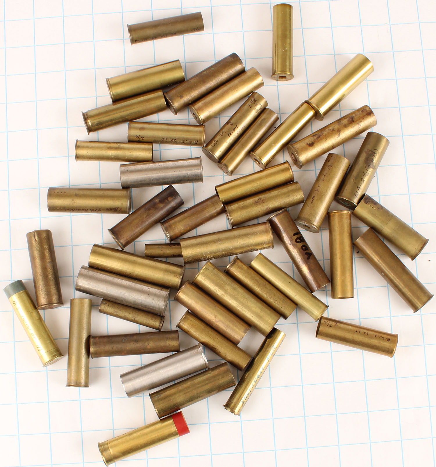RARE! Large lot of empty Early brass and nickel shotshells, mixed H/S, mixed gauges ranging from 10, 12, 14, 16, 18, 20, 24, 28, 32 and 36. Grade: Very Good ++ - Value: 10 to 100