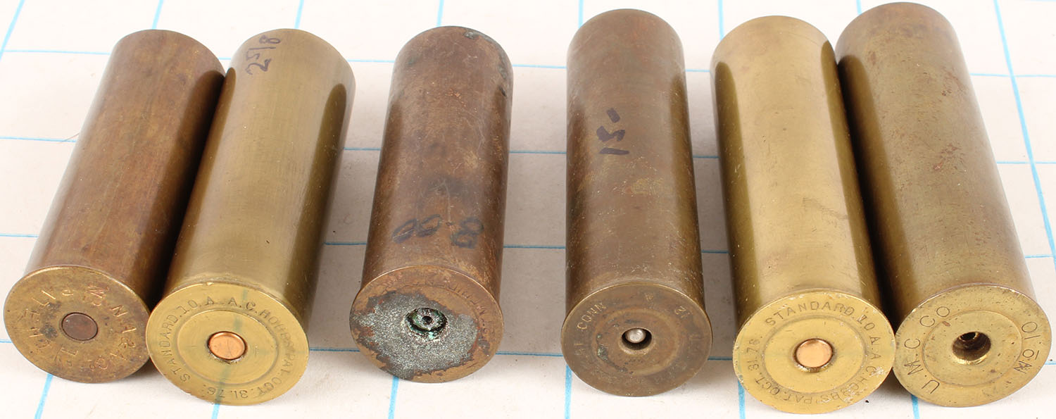 Lot of 6 empty brass shotshells, mixed H/S, mixed gauges. Grade: Very Good ++ - Value: 6 to 50