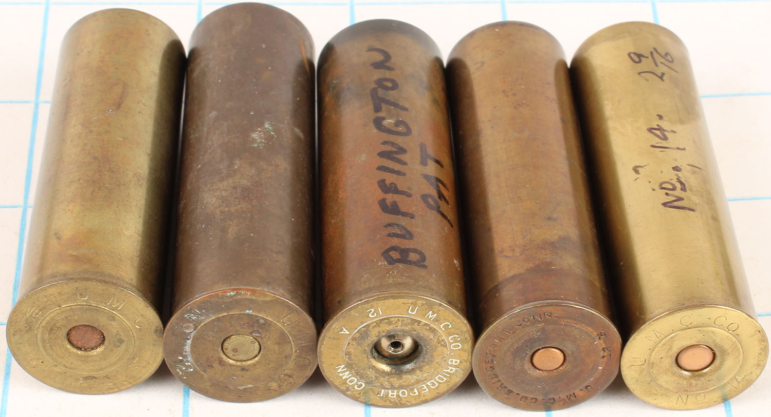 Lot of 5 empty brass shotshells, mixed H/S, mixed gauges. Grade: Very Good ++ - Value: 6 to 50