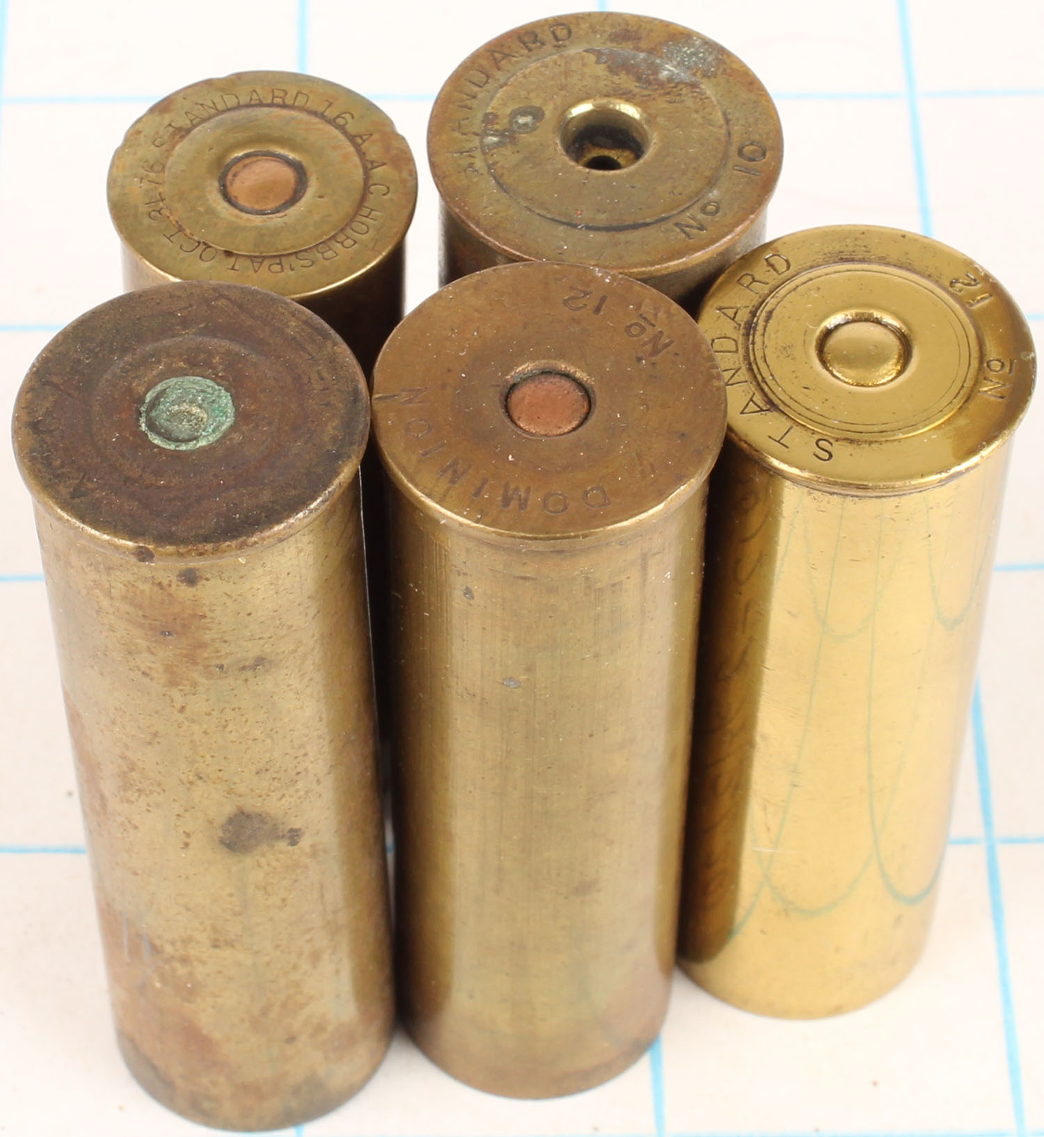 | Lot of 5 empty brass shotshells, mixed H/S, mixed gauges. Grade...