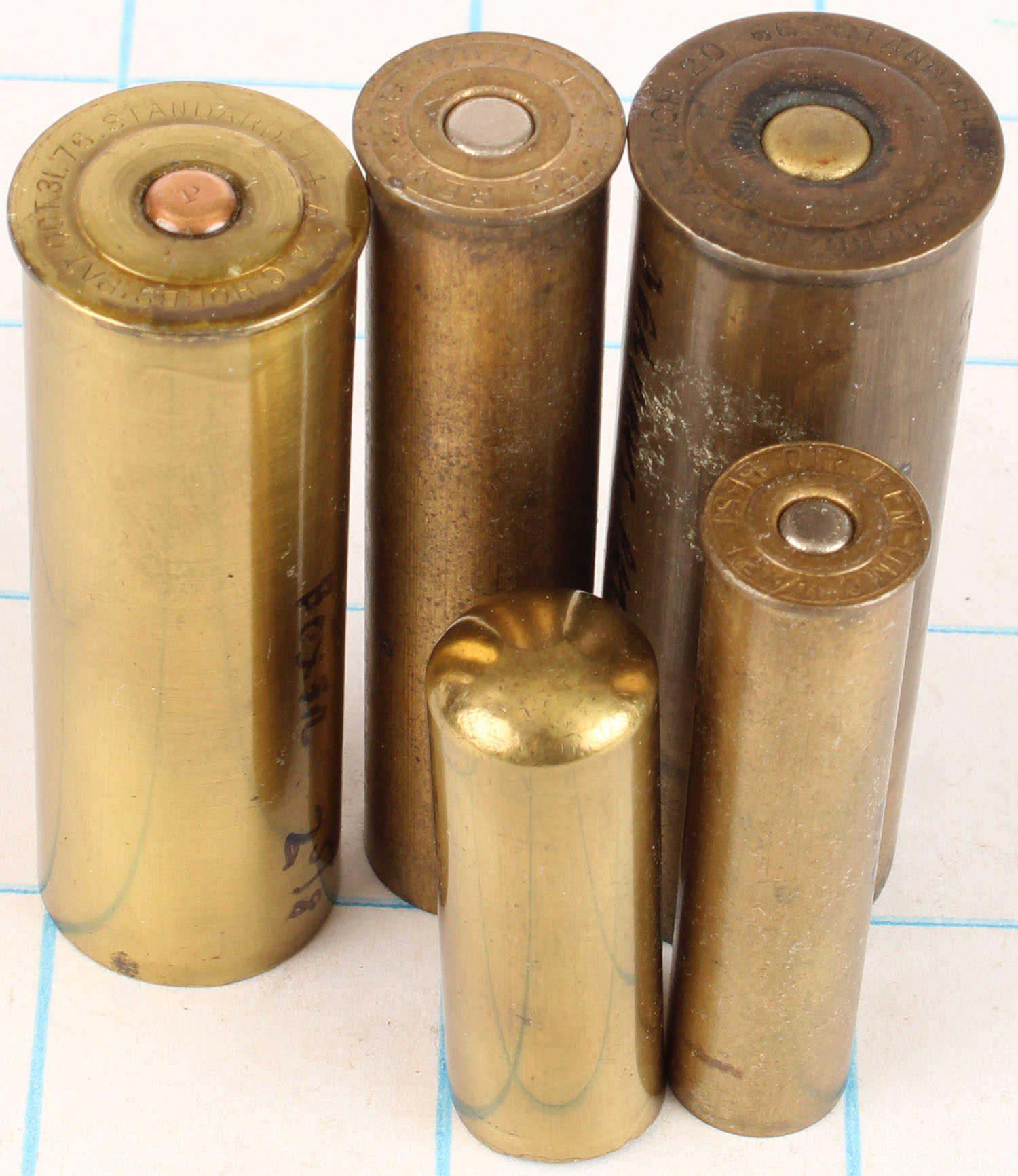 | Lot of 5 empty brass shotshells, mixed H/S, mixed gauges. Grade...