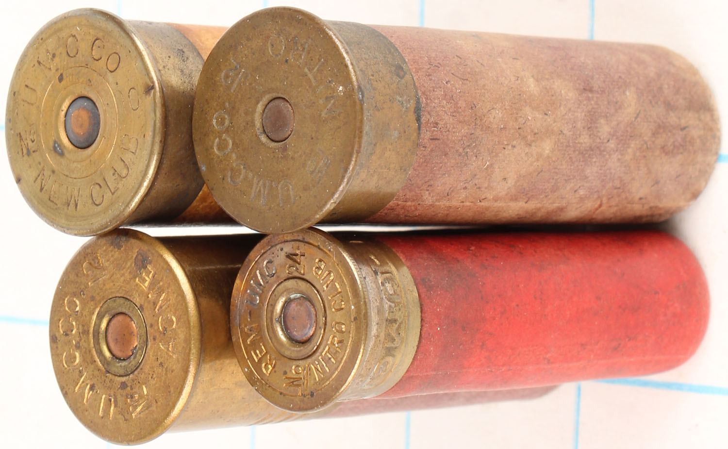 Lot of 4 loaded paper shotshells, U.M.C. mixed gauges. Grade: Excellent - Value: 6 to 30