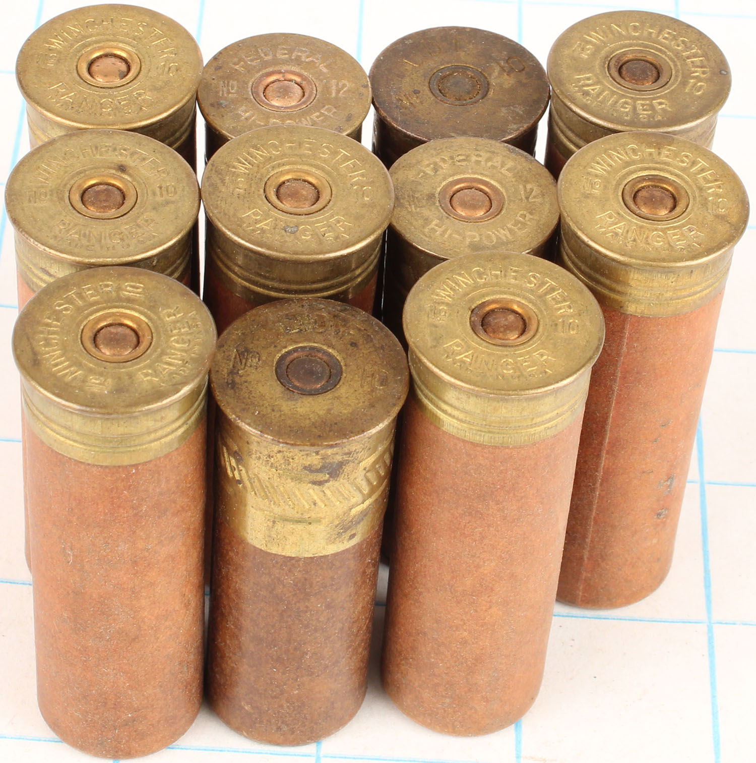 Lot of 11 loaded shotshells in paper cases, mixed H/S, 10ga. Grade: Very Good ++ - Value: 6 to 30