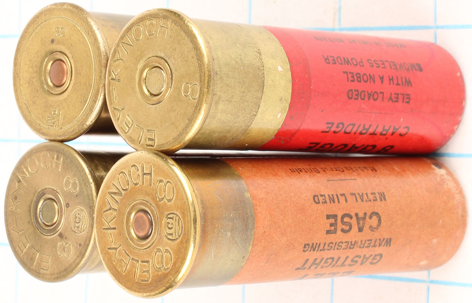 Lot of 4 loaded paper shotshells, 8ga, 3 1/16'' OAL. Grade: Very Good ++ - Value: 10 to 100