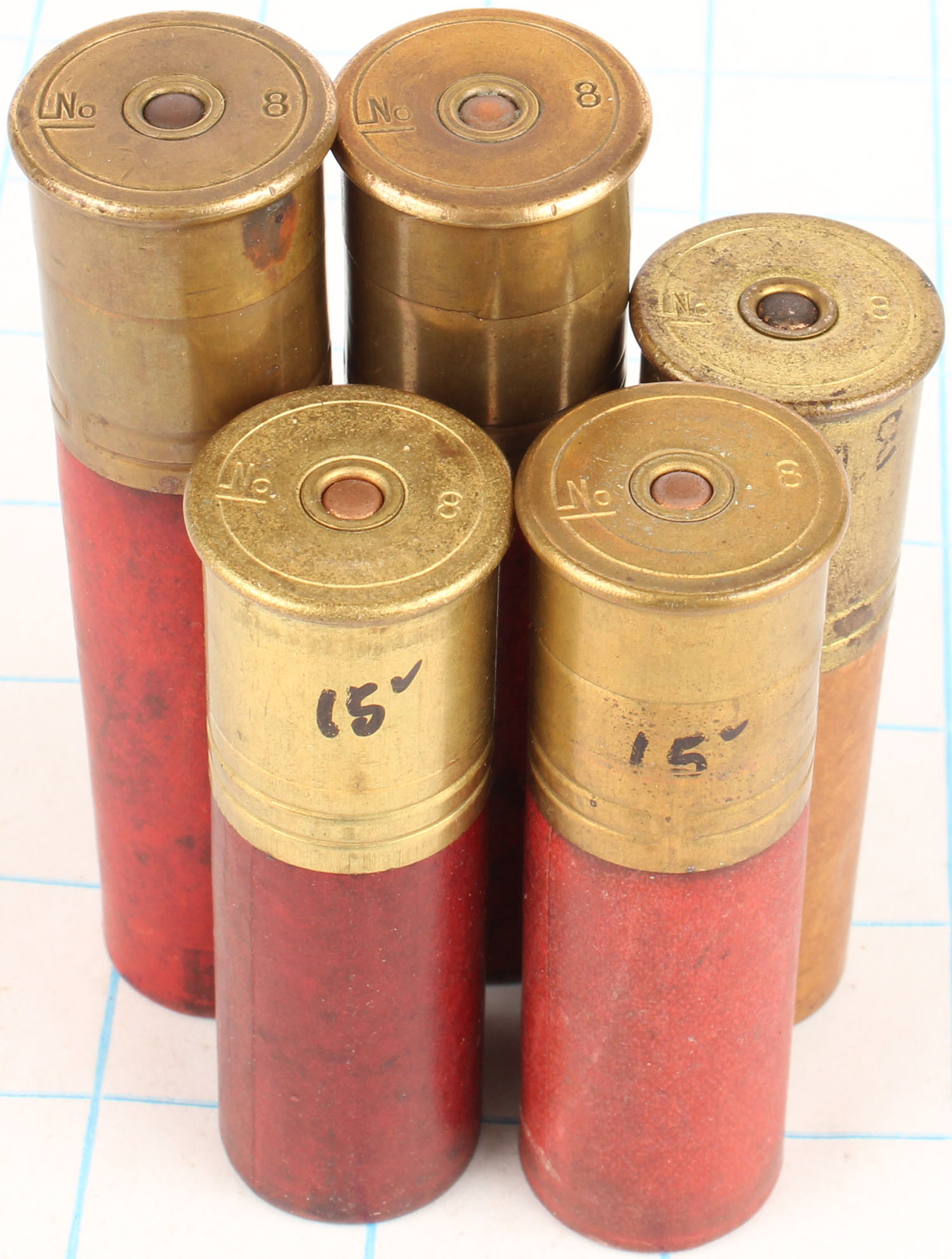 | Lot of 5 loaded paper shotshells, mixed H/S, 8ga. Grade: Very G...